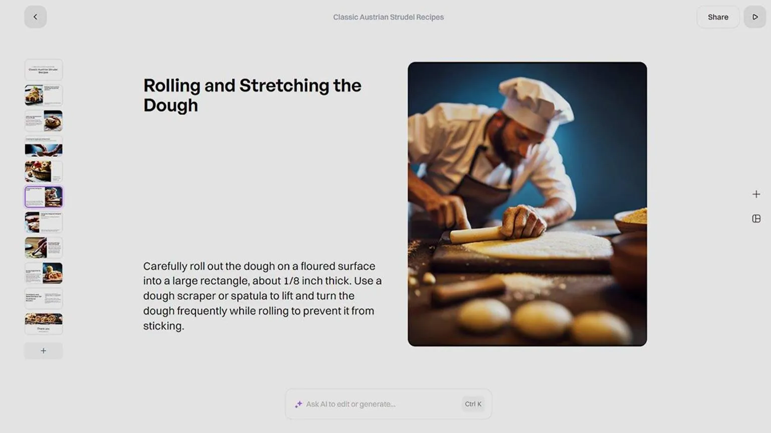 Возможности. Можно превратить документ в презентацию или сгенерировать текст на заданную тему. Нейросеть сопровождает слайды сгенерированными фотореалистичными картинками. Готовую презентацию можно редактировать вручную или с помощью ИИ: просить изменить объём текста, добавить абзац о чём-то, переписать текст, сделать новую иллюстрацию в заданном стиле — от 3D до аниме.
