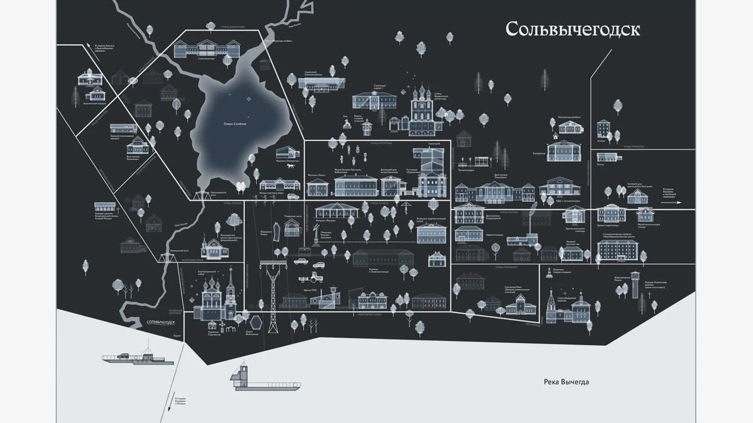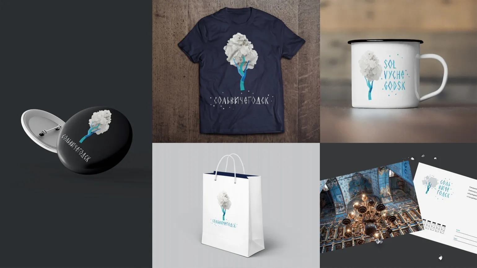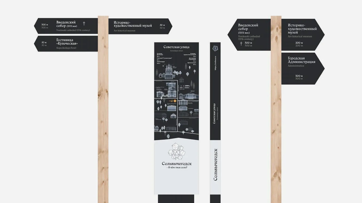 Ещё одна разработка от «Асмысла» — фирменный стиль Сольвычегодска, небольшого города-курорта в Архангельской области. Чтобы до него добраться, нужно сначала ехать на поезде или машине до Котласа, а потом ещё плыть на пароме.