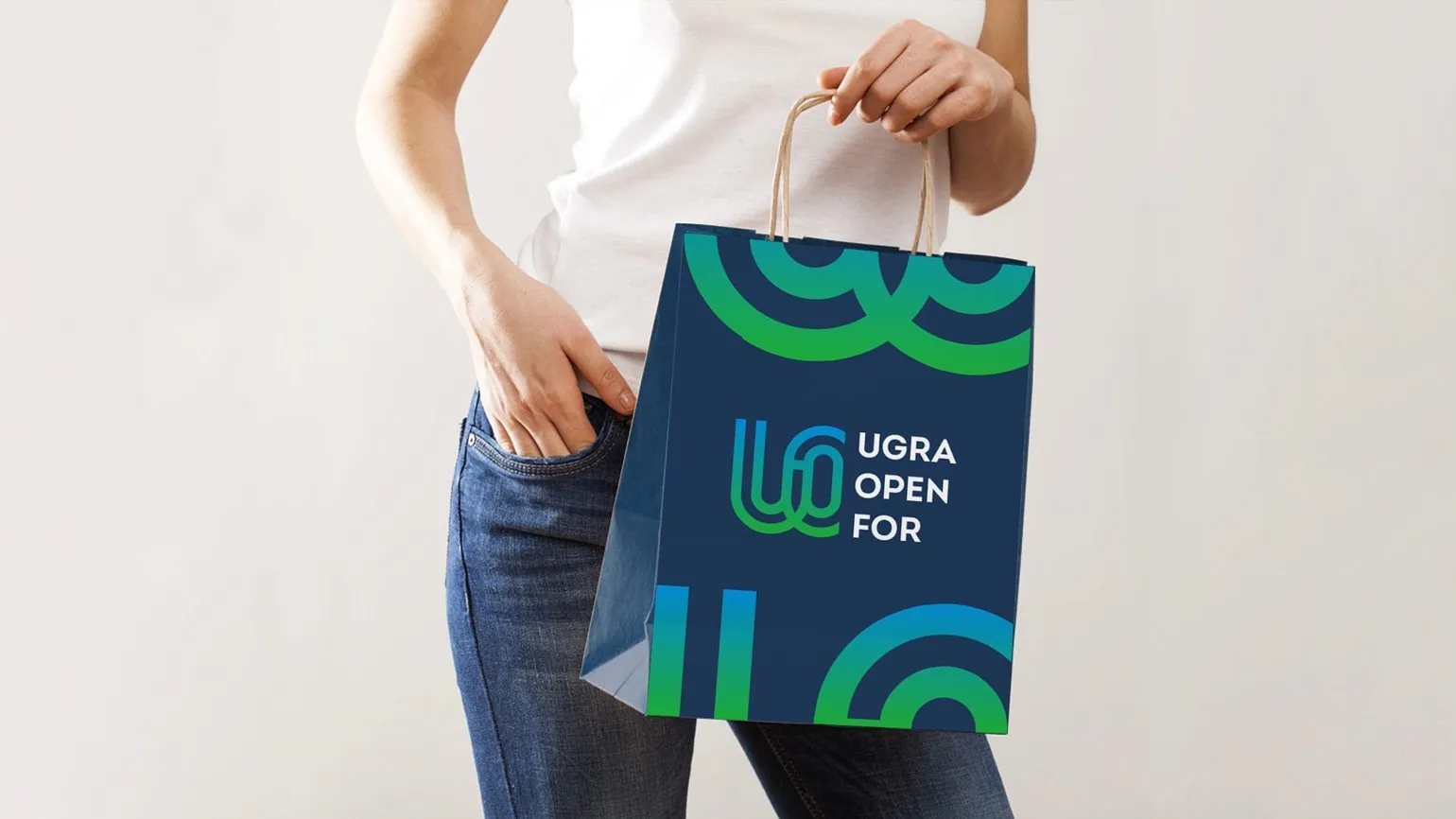 Логотип бренда Югры состоит из двух частей ― знака и слогана/названия бренда: «Ugra Open For» или «Югра открыта для». Дизайнерам было важно отразить в слогане название региона и при этом сделать его лёгким для восприятия как на русском, так и на английском языке, ведь округ с этой айдентикой будут представлять и на международных выставках.