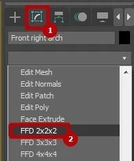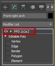 Выделите арку и перейдите на командную панель во вкладку Modify, в выпадающем списке выберите модификатор FFD 2x2x2 — модификатор свободных деформаций.