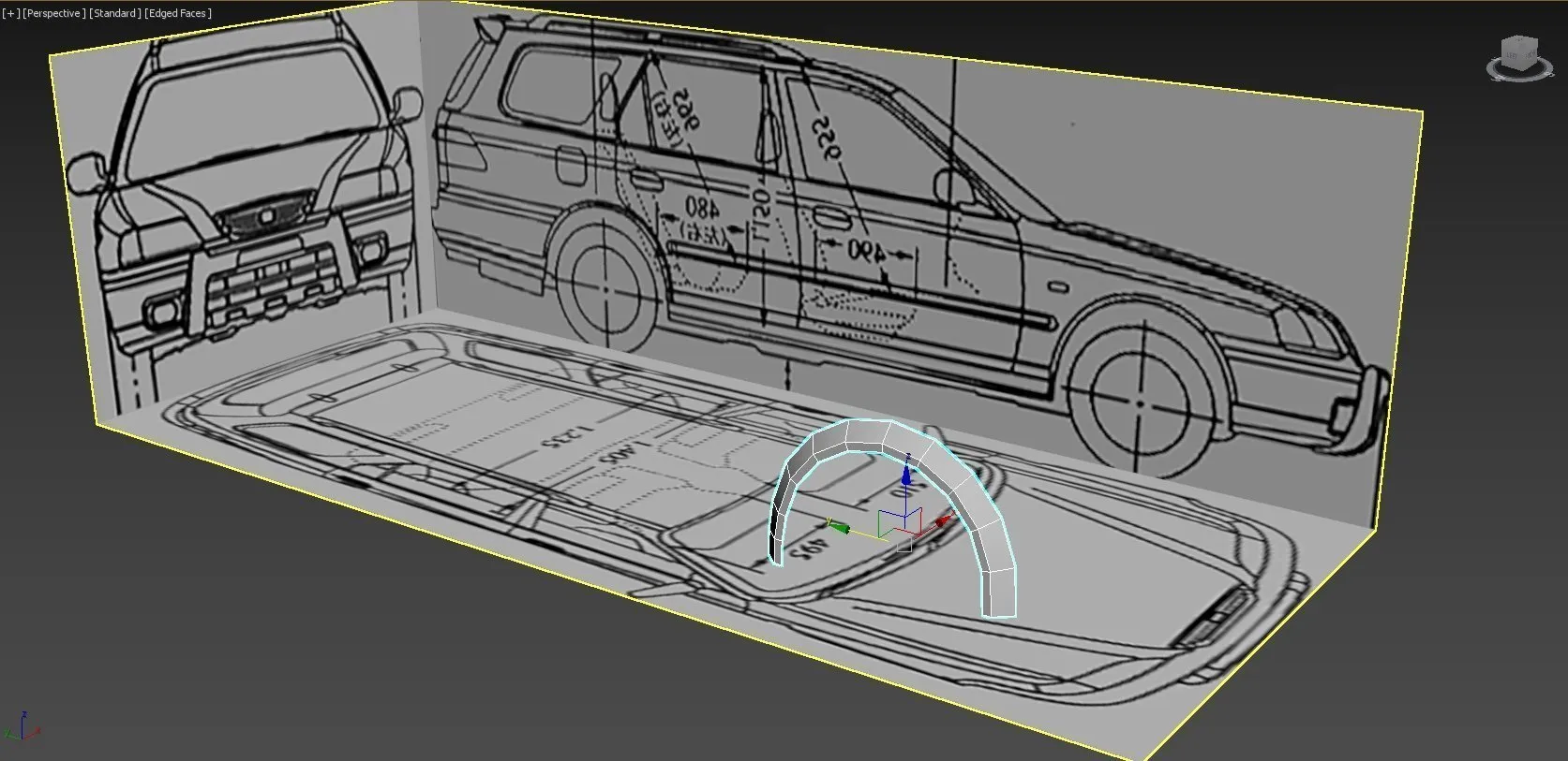 - Моделирование из бокса. По габаритам автомобиля создаётся бокс с дополнительными рёбрами, он конвертируется в Editable Poly. За счёт перетаскивания вершин формируется основной грубый облик авто, затем нарезаются рёбра и уточняется форма.