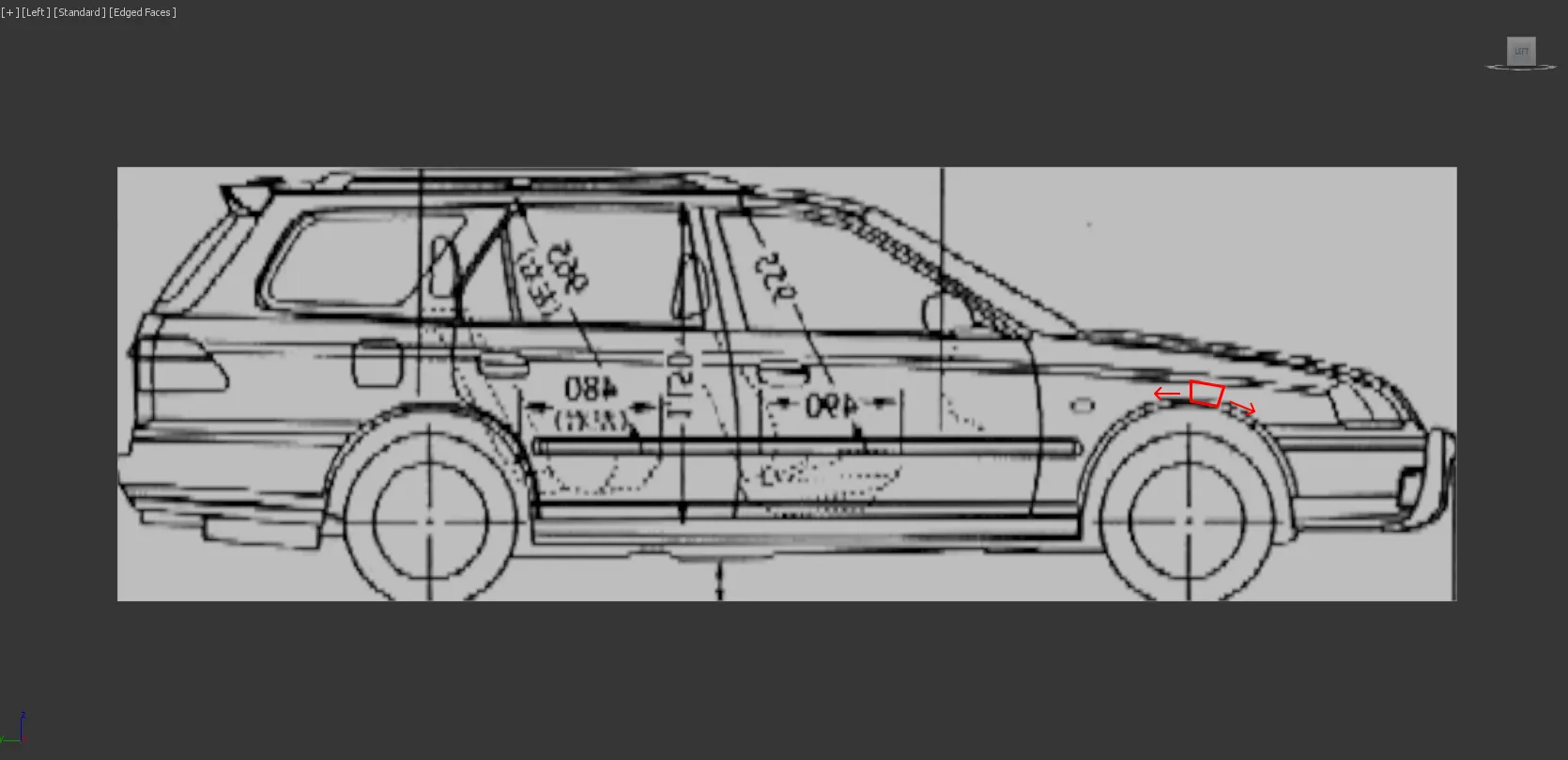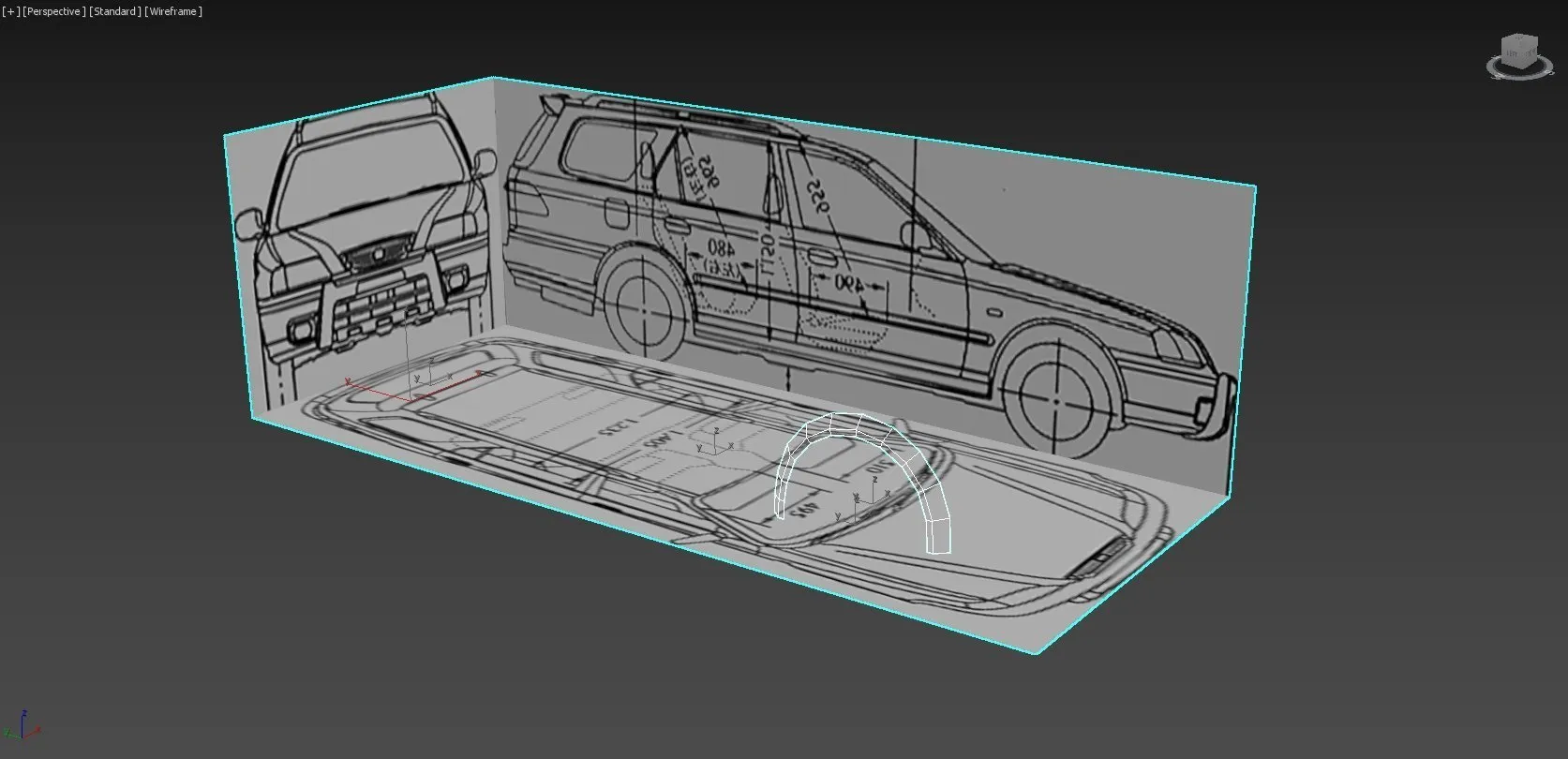 - Сплайновое моделирование. Наносятся сплайны (линии) по основным линиям автомобиля относительно чертежей с привязкой к точкам в пространстве. Затем с помощью модификатора Surface формируется поверхность по полученным сплайнам, далее идёт работа с поверхностью. Сплайны, как и бокс, сразу дают большую поверхность.