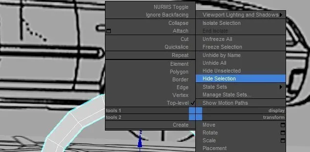 Вернёмся к нашей арке. У вас есть независимая копия. Выделите её и вызовите правой кнопкой мыши контекстное меню. Выберите пункт Hide Selection (Спрятать выделенное). Это нужно, чтобы впоследствии опереться на этот элемент как на шаблон либо использовать как заготовку, если вдруг испортим оригинал, заодно и навык скрытия элементов отработаем.