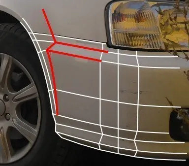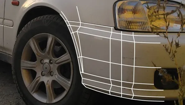 Естественно, это не финальная сетка, а лишь набросок основных плоскостей и разбор профилей. Схема поможет понять, где и как образуются сопряжение и переход сложных зон. На линиях, которые я обозначил на фотографии выше, понятно, где прерывается отбортовка, которая шла по арке и продолжилась на бампере. Также прояснился момент перехода сложной плоскости верхней части бампера.