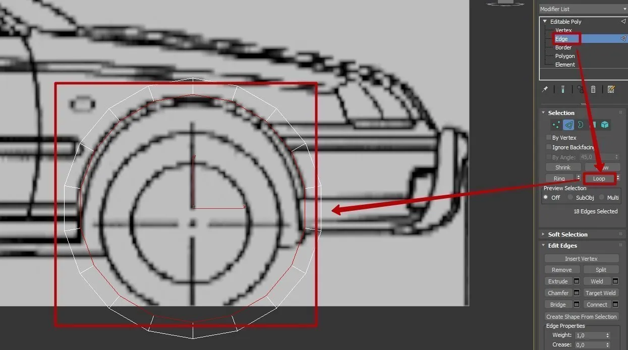 Теперь нужно дополнить рёбра отбортовки. Для этого перейдите на уровень подобъектов Edge и выделите рёбра окружности с малым диаметром с помощью инструмента Loop. Делается это так: вы сначала выделяете одно ребро, нажимаете Loop в свитке Selection командной панели — и у вас автоматически выделяются все рёбра окружности с малым диаметром.
