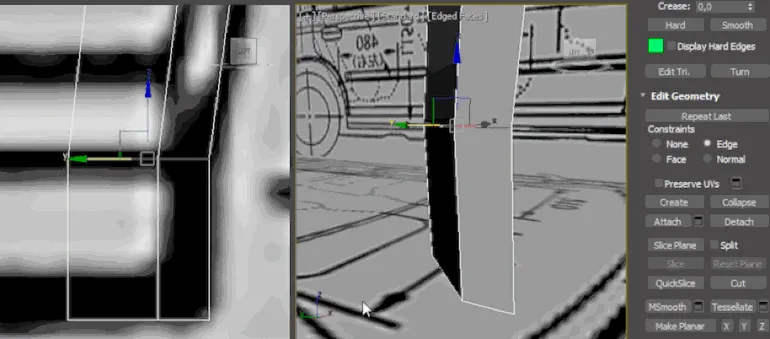 С помощью инструмента Ring выберите нужные рёбра, а с помощью инструмента Connect добавьте их. Затем в свитке Edit Geometry — Constraints выберите пункт Edge — это нужно для того, чтобы перемещение вновь созданных рёбер было ограничено рёбрами, вдоль которых мы будем перемещаться. Это гарантия того, что мы случайно не сдвинем их. Передвиньте созданные рёбра к месту перехода кузова в порог.