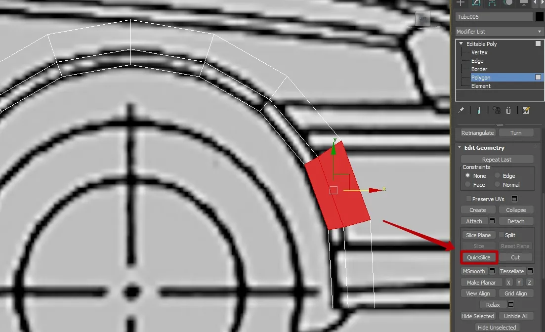 Теперь выделите полигоны, указанные на скриншоте, и выберите инструмент QuickSlice (Быстрая нарезка) на командной панели в свитке Edit Geometry,