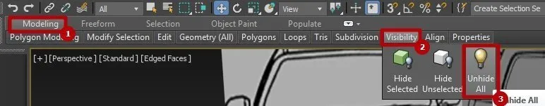 Перейдите на панель и выберите Hide Selected: Ribbon — Modeling — Visibility — Hide Selected. Все выбранные полигоны скроются.