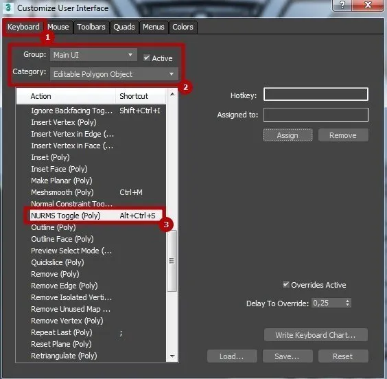 В списке ниже выберите пункт NURMS Toggle (Poly) и назначьте удобную для вас горячую клавишу справа в поле Hotkey.