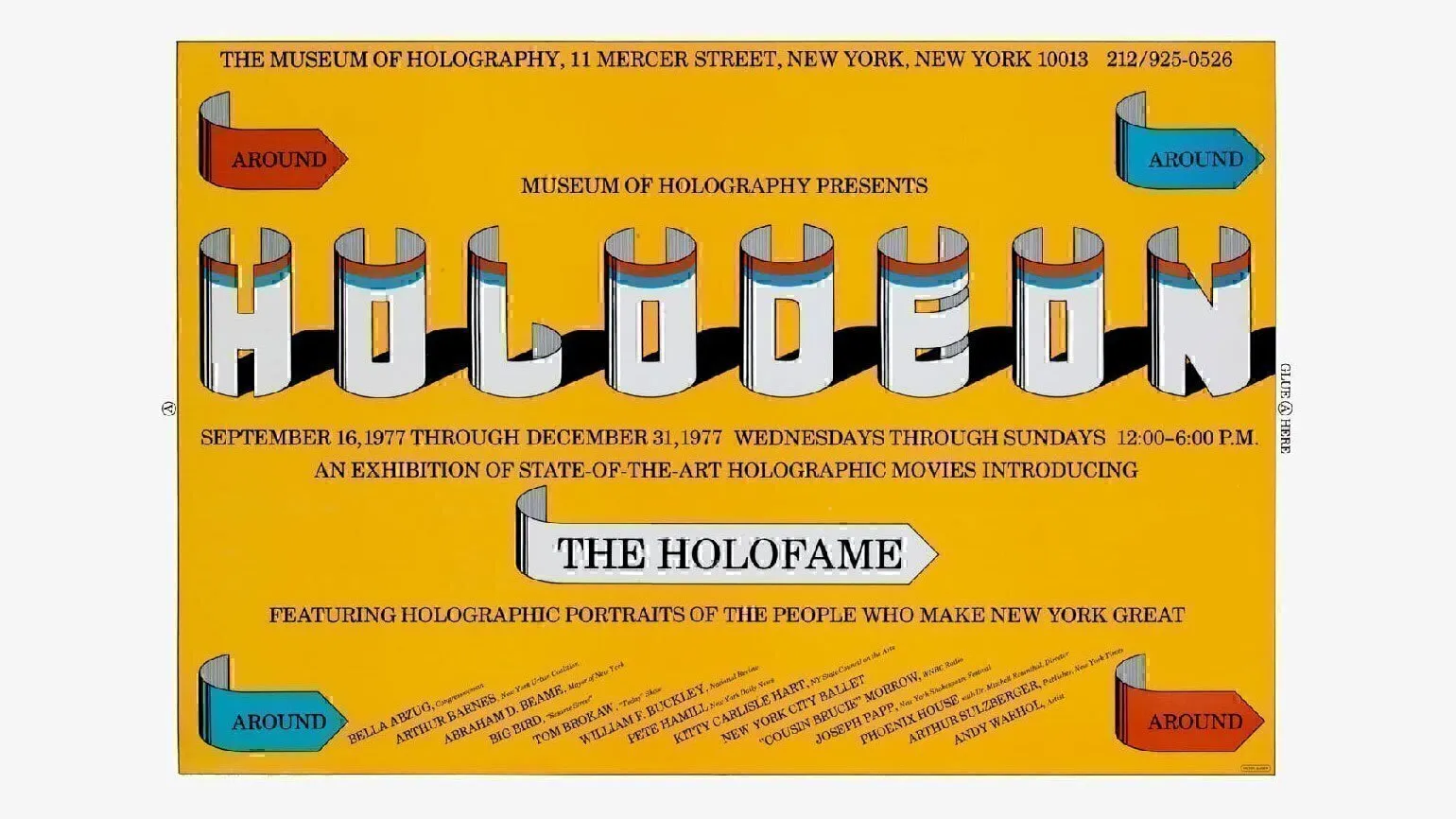 Голография создаёт реалистичные объёмные изображения, и Глейзер сделал для рекламы этого музея объёмные буквы, чтобы пробудить интерес к выставке. При этом композиция не перегружена сложными формами и всю информацию на плакате легко воспринимать.
