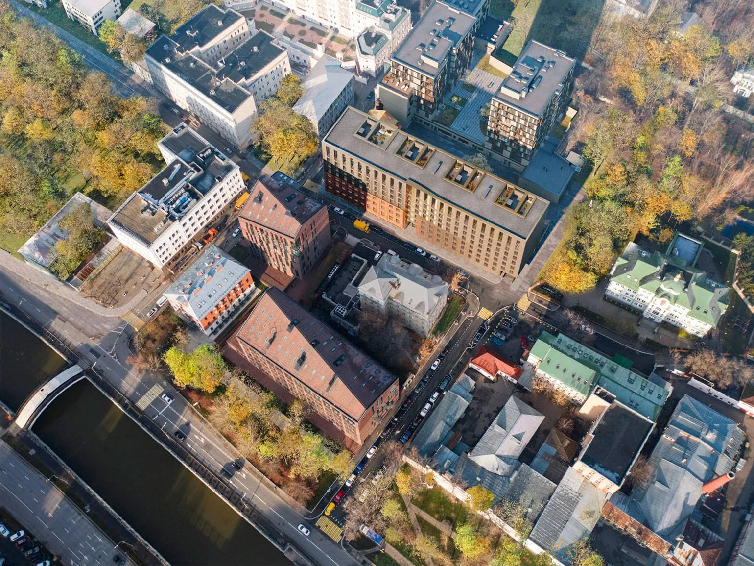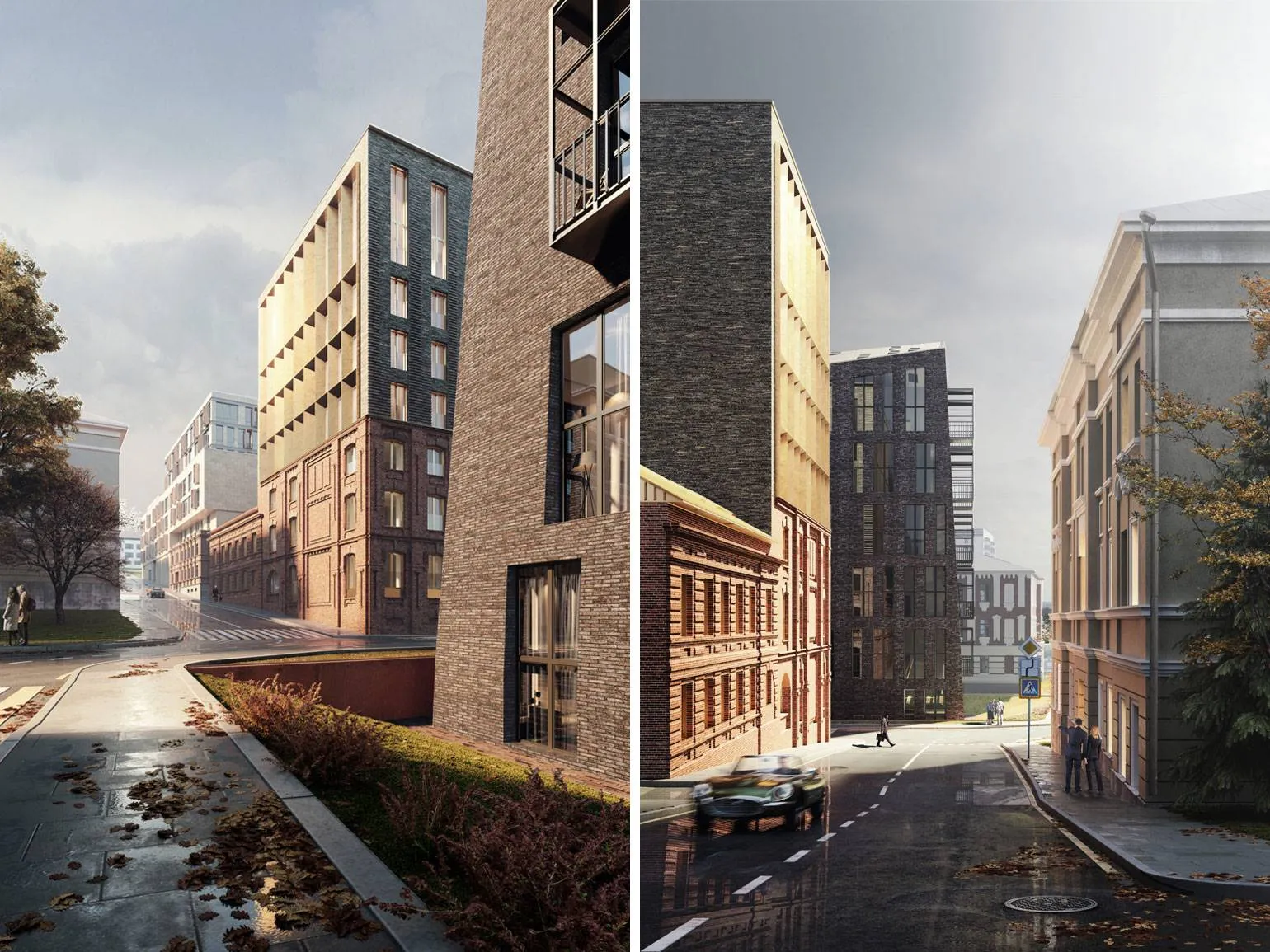 Клубный дом «Тессинский-1» — проект архитектора Сергея Скуратова. Вписан в пространство среди домов XIX–XX веков. Исторический баланс соблюдён благодаря отреставрированным фасадам с брусковым кирпичом и современным бронзовым панелямИзображение: жилой комплекс «Тессинский, 1» / Sergei Skuratov Architects