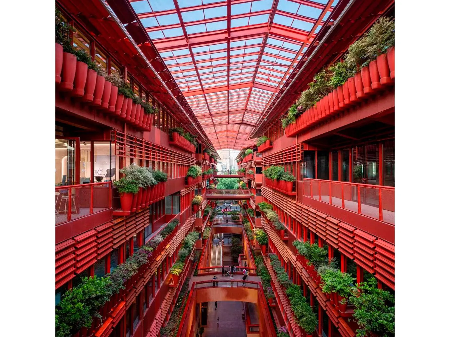 Парные здания CIFI Xintiandi с офисными и коммерческими помещениями — проект Aspect Studios и архитектора Жана Нувеля. На фасадах — растения в глиняных горшках, на крышах — сады с деревьями и кустарникамиФото: Aspect Studios