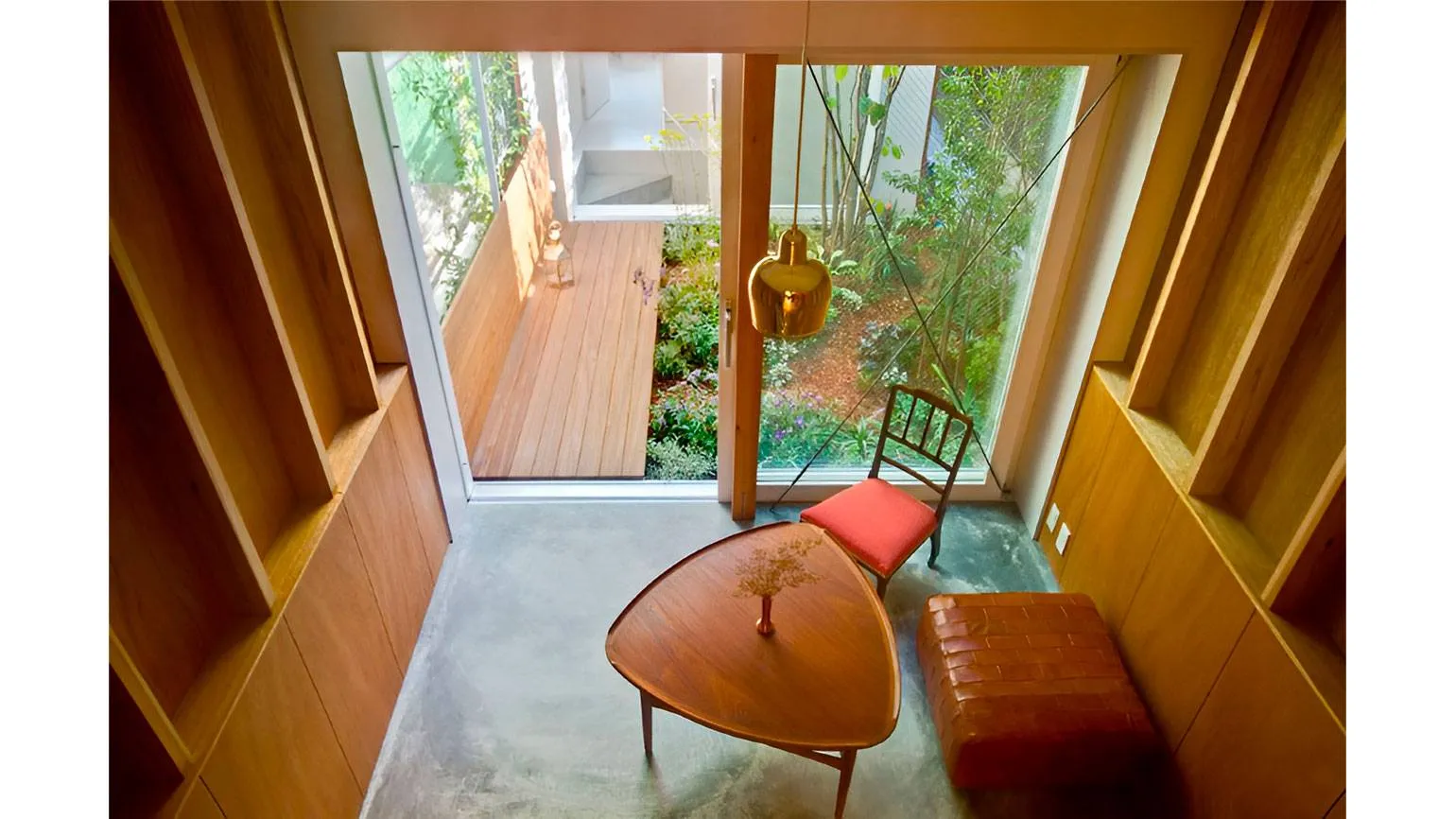 Жилой дом Split Machiya встроен в небольшой промежуток между зданиями и состоит из двух зеркальных частей, между которыми расположен зелёный внутренний дворикФото: Manuel Oka / Atelier Bow-Wow