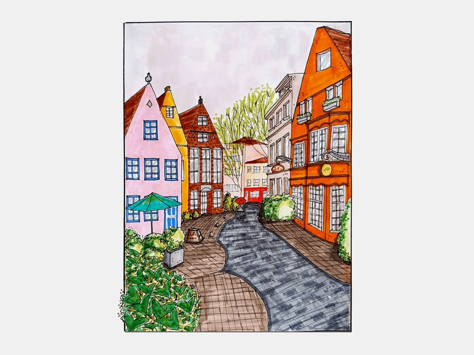 - Бытовой скетчинг. Это зарисовки зданий, улиц, прохожих, сцен, локаций — всего, что окружает нас в обыденной жизни.