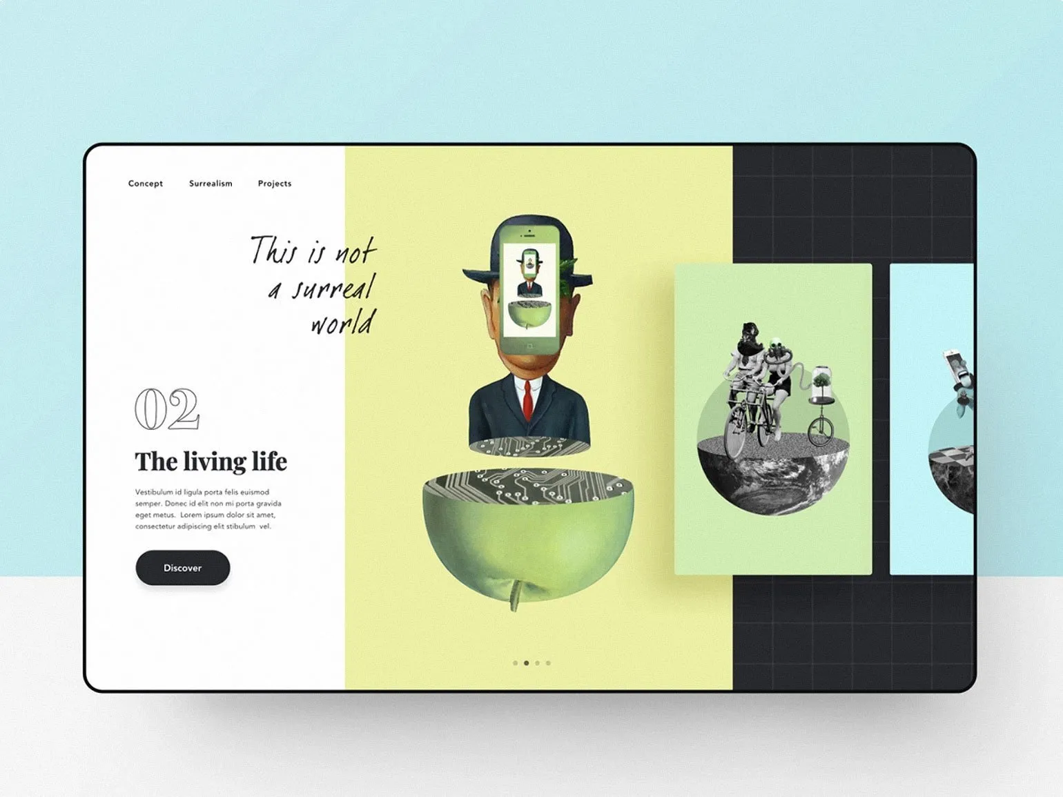 Дизайн на выходе получается акцентным за счёт сложной композиции, но всё ещё остаётся минималистичным, так как используется минимум цветов (которые могут быть суперяркими), один-два шрифта и выдержанная сетка.
