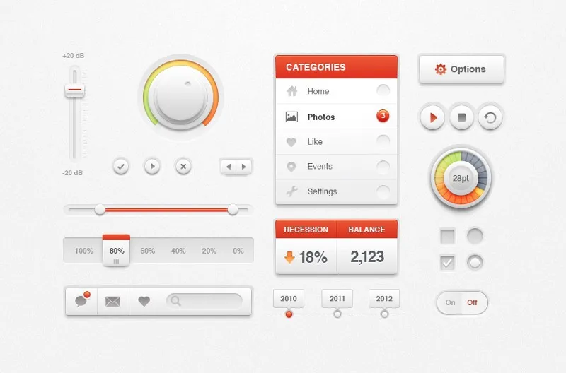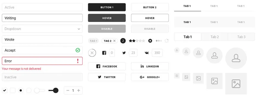 Набор элементов кита зависит от того, для чего его создавал дизайнер. UI kit будет разным для e-commerce и корпоративного сайта, блога и музыкального плеера. Рассмотрим самые распространённые.