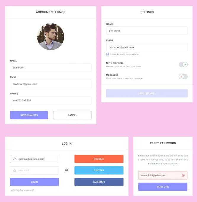 Всё, что придётся заполнять пользователю: форма регистрации, обратной связи, оформления заказа.
