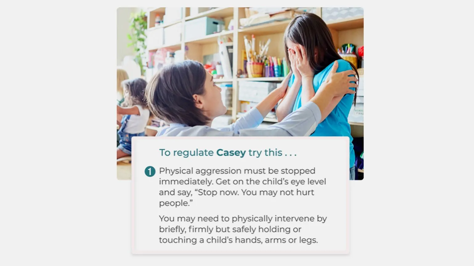 На скриншоте ниже приведена часть опросника Noni — здесь приложение просит учителя отметить, каким было поведение одного из учеников. В графе отмечена физическая агрессия, поэтому программа просит сообщить, в отношении кого она зафиксирована — другого ребёнка или взрослого. На втором скриншоте показан совет программы о том, как остановить такие проявления.