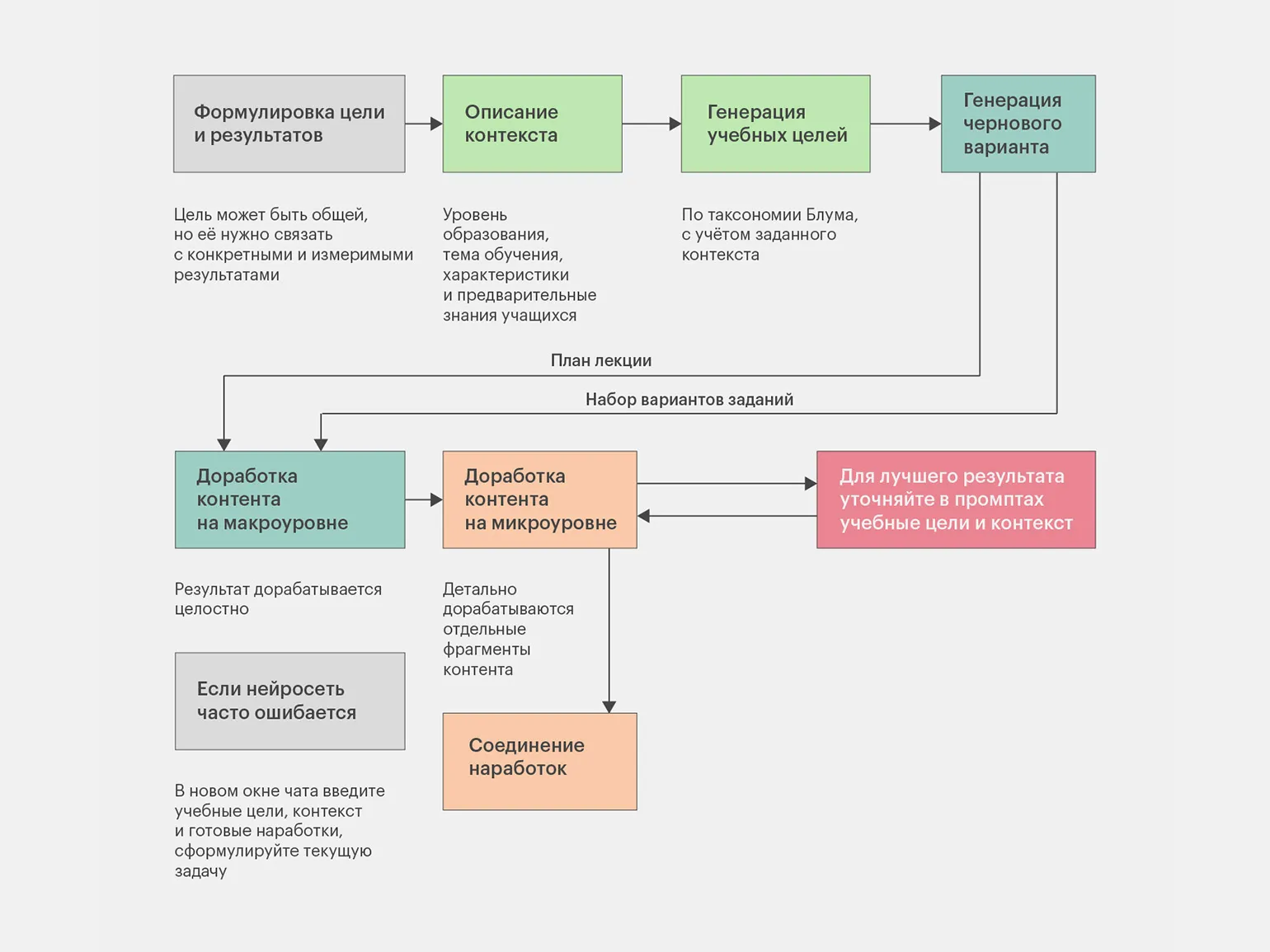 Эта инструкция предполагает гибкий итеративный подход, при котором человек контролирует весь процесс создания материалов, улучшая и адаптируя их.
