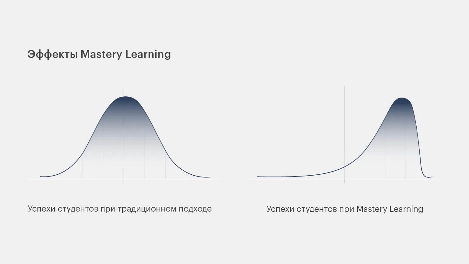 Дмитрий отметил, что за сорокалетнюю историю подход Mastery Learning доказал свою эффективность. Если при традиционном подходе к обучению основная масса учеников показывает средние результаты, а кроме них есть те, кто справляется лучше или хуже, то при Mastery Learning большинство сдвигается в сторону отличных результатов.