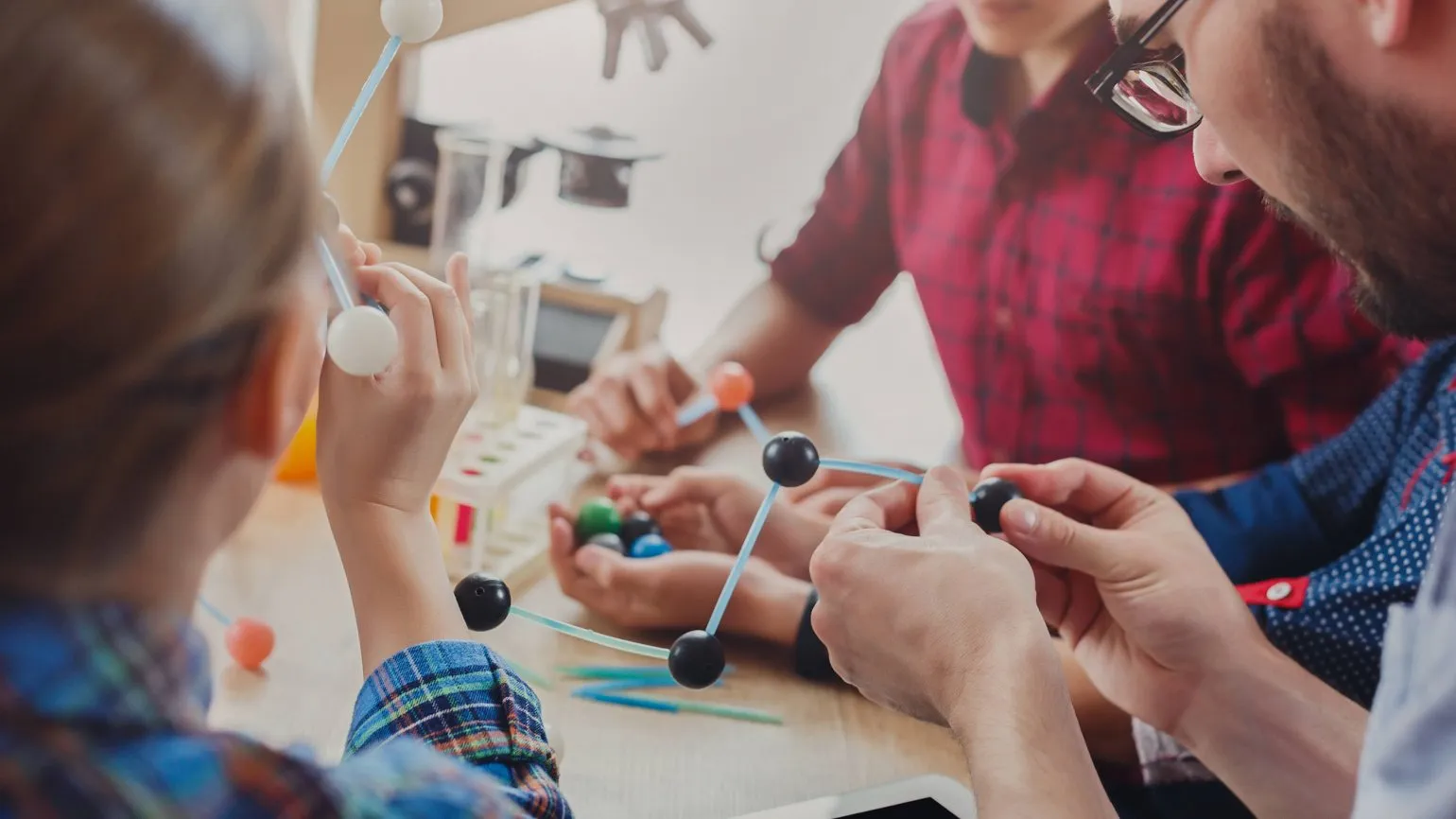 Второй компонент — тактильные манипуляции. Для него предусмотрен физический обучающий набор, на конструктах которого сделаны пометки шрифтом Брайля. С его помощью можно в буквальном смысле пощупать, например, атомы в модели молекулы и перестроить их так, как подсказывает аудиопомощник.