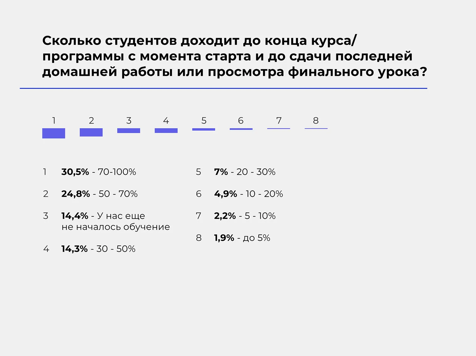 Относительно доходимости на курсах 30,5% респондентов заявили, что в их школах этот показатель составляет 70–100%. Это на 10,5% больше, чем в 2019 году.