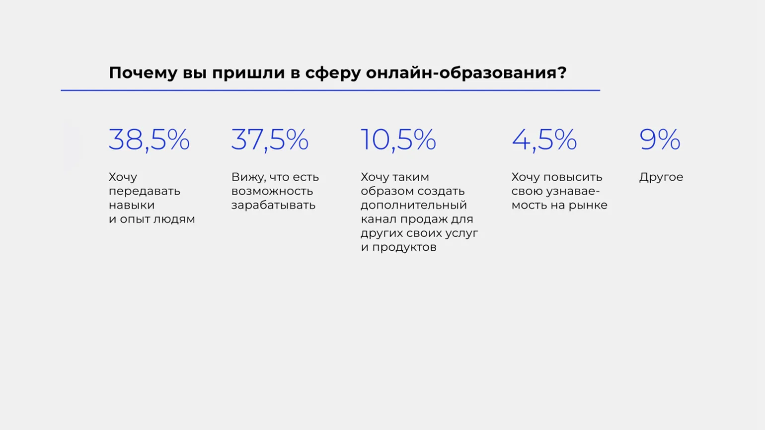Половина опрошенных пришла в онлайн-образование из близких отраслей — образования и практик саморазвития (вероятно, во втором случае имеются в виду коучи и бизнес-тренеры), а также медиаиндустрии, а другая половина — из совершенно разных сфер деятельности. Причём больше половины (55,7%) раньше были сотрудниками в найме. Авторы исследования отметили негативную сторону этого фактора: похоже, многие люди запускают свои проекты по онлайн-обучению просто потому, что считают это источником лёгкого заработка (хотя он вовсе не лёгкий).