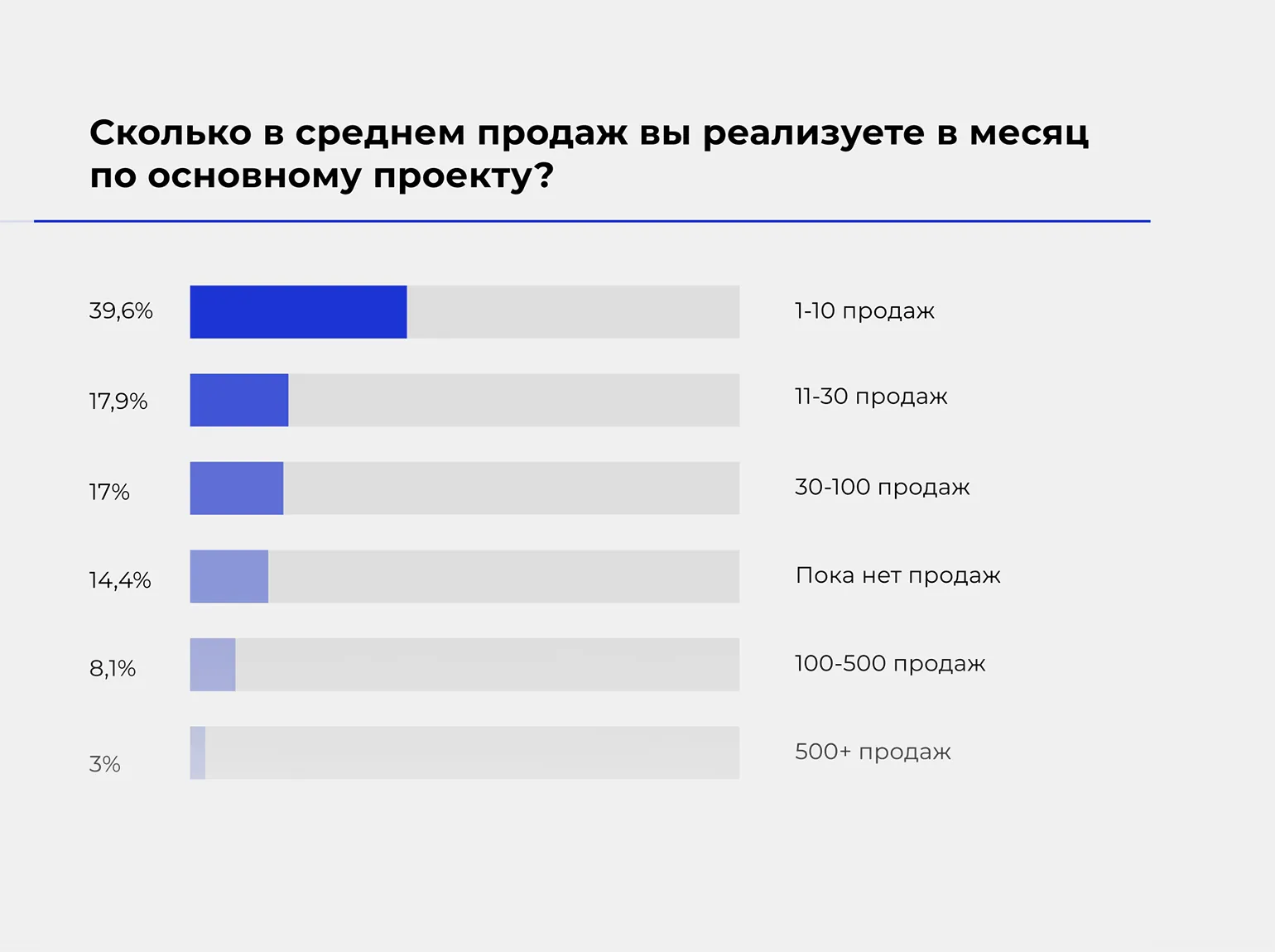 Среднее число продаж в месяц чаще всего составляет не более десяти (39,6%). Однако у 11,1% их количество превышает сотню.