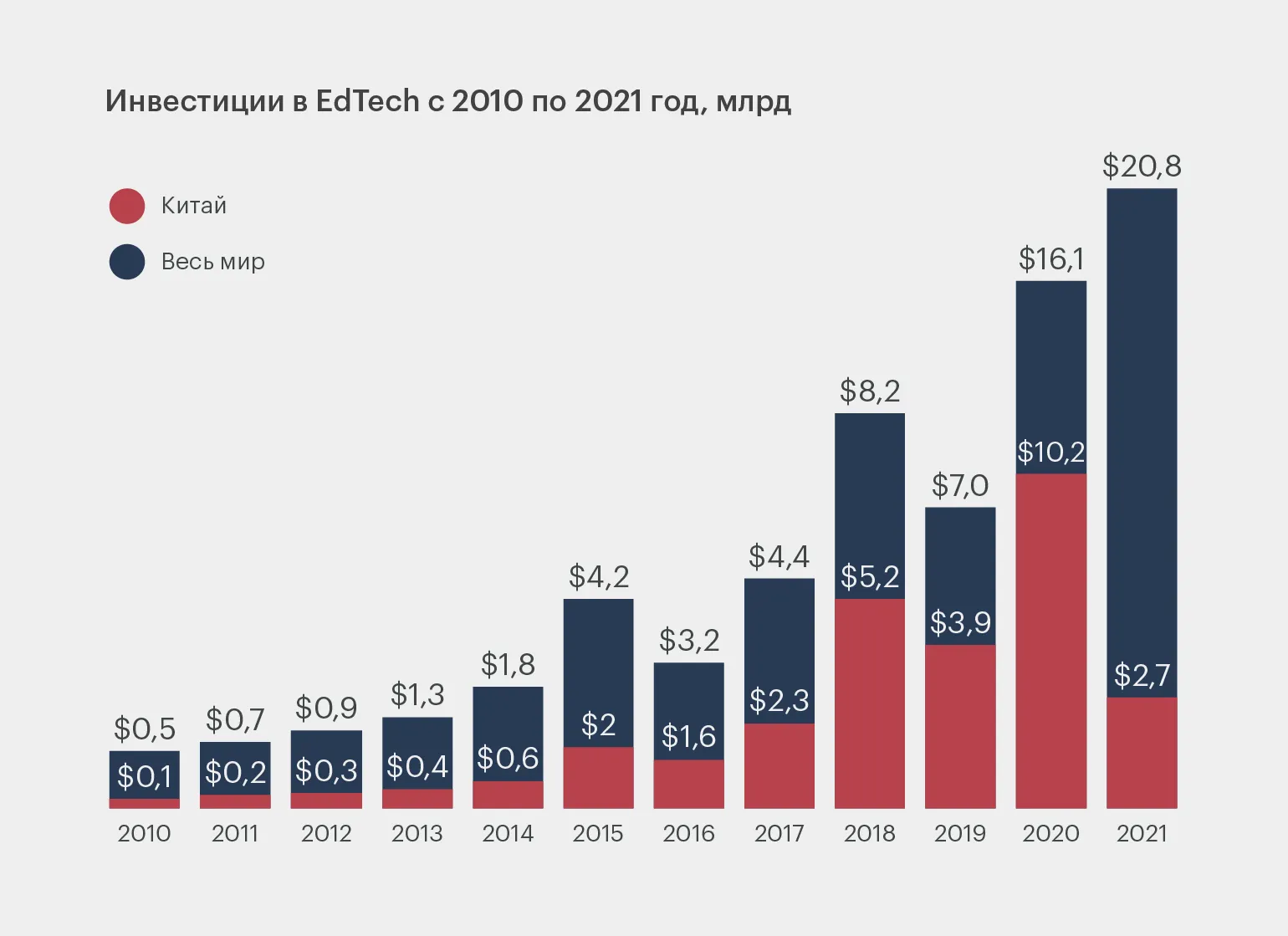 В июле 2021 года власти Китая объявили о масштабной реорганизации национального EdTech-сектора. Образовательным сервисам для школьников запретили привлекать капитал, выходить на биржу и получать прибыль. Это привело к рекордному оттоку инвестиций из китайского EdTech. Если в 2020 году образовательные компании из Поднебесной привлекли 10,2 млрд долларов, то в 2021-м — только 2,7 млрд. Позже ограничения ослабили, но это уже мало повлияло на ситуацию.
