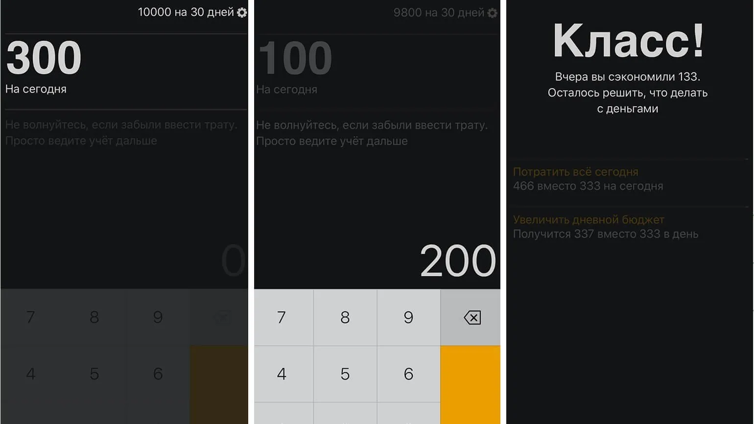Самый минималистичный учёт личных финансов: пользователь просто вносит имеющийся бюджет и записывает свои траты, а приложение показывает, сколько денег осталось и сколько нужно тратить, чтобы не «выскочить» из лимита. Можно установить бюджет на срок от 1 до 40 дней.