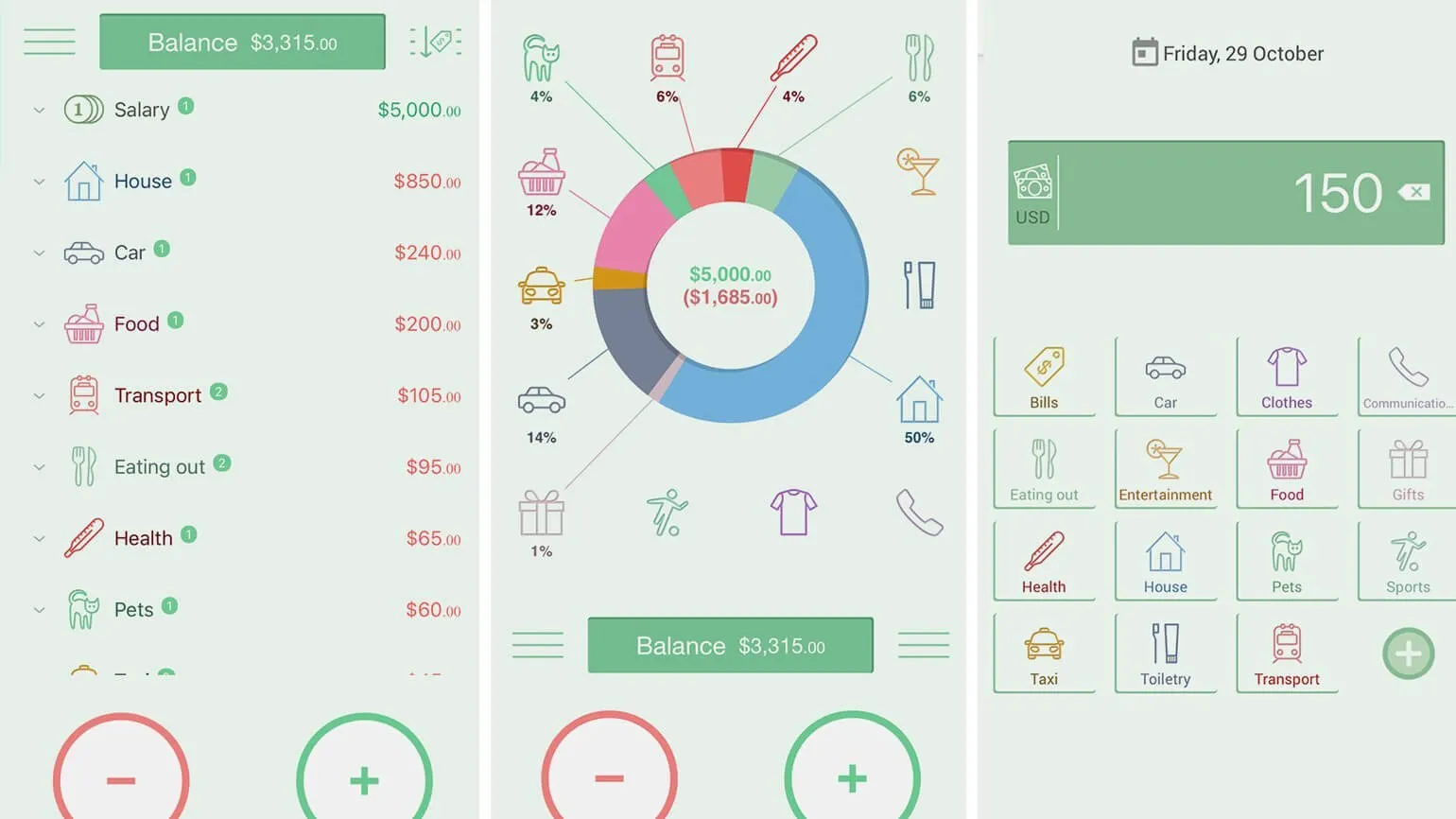 У приложения Monefy удобный интерфейс, всё необходимое пользователь увидит сразу на главном экране. Траты можно разбивать по категориям или временному периоду. Удобно анализировать статистику и рассчитывать бюджет с помощью встроенного калькулятора.