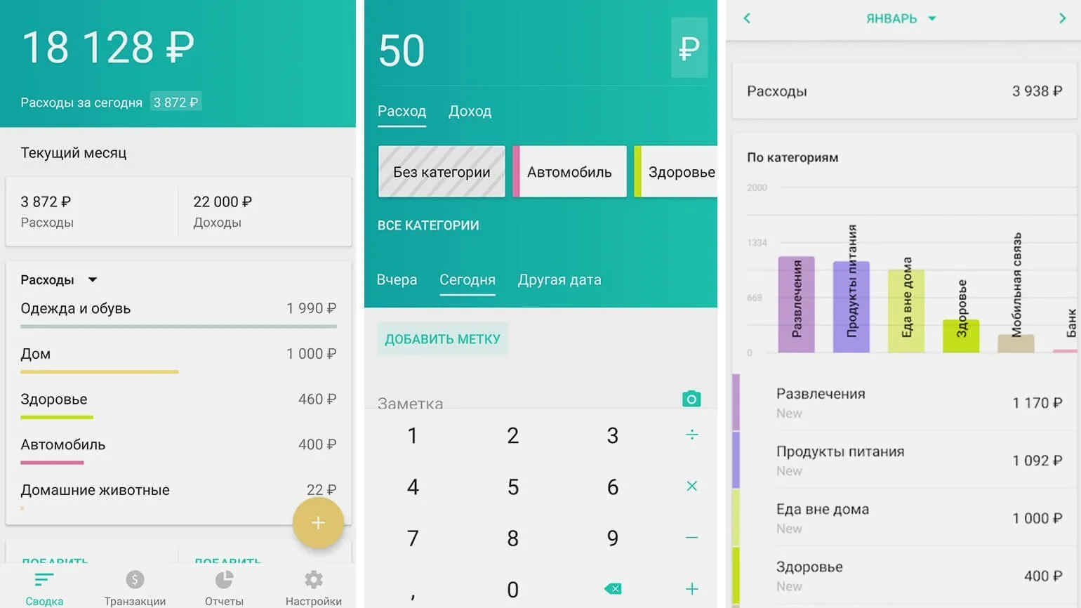 Приложение, в котором вводить доходы и расходы можно только вручную. Но при этом в бесплатной версии есть все первостепенные инструменты для аналитики и планирования личных финансов: можно распределить траты по категориям, посмотреть, сколько в среднем тратите в день и за месяц. В приложении минималистичный, интуитивно понятный дизайн без лишней информации.