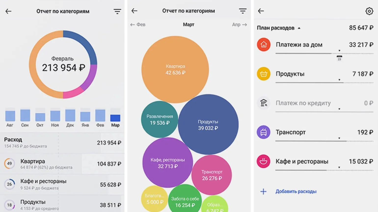 Российское приложение с возможностью привязать банковские карты, которыми вы пользуетесь. На основе ваших транзакций приложение предоставляет аналитику в виде наглядных круговых диаграмм, определяет обязательные расходы и траты по разным категориям, прогнозирует списания с карт (например, за подписки), помогает определить, сколько денег нужно до конца месяца и сколько осталось «свободных» денег.