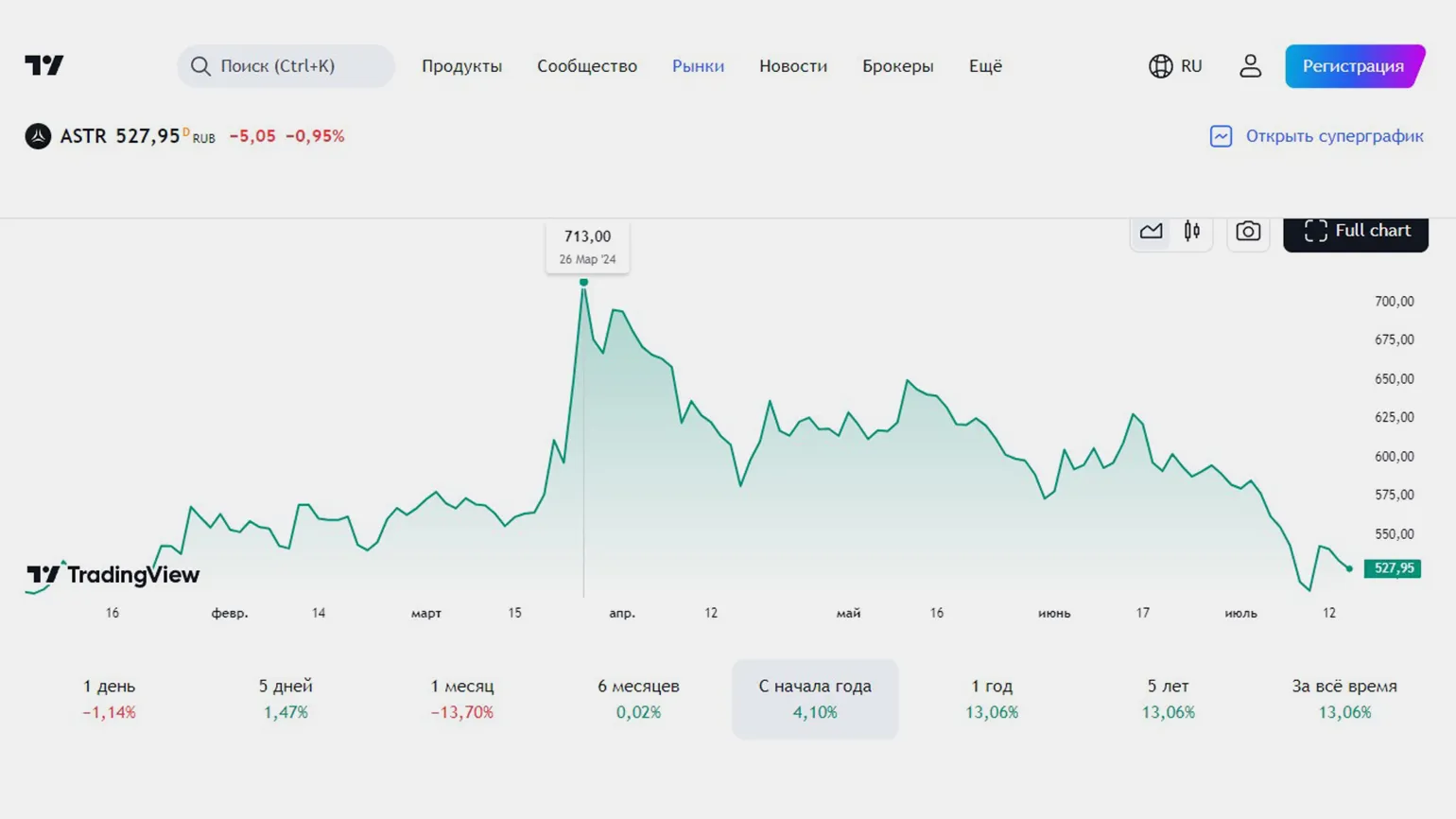 Первый пример — IPO «Астры». 13 октября 2023 года состоялся листинг акций «Астры» по цене 333 рубля за штуку. 16 июня 2024 года стоимость акций составляла 525 рублей — то есть акции выросли на 57%.
