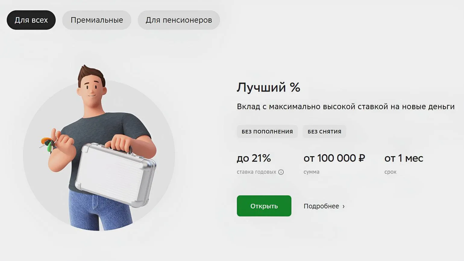 Минимальная сумма для открытия вклада может быть небольшой — например, 1000 или 5000 рублей. Её тоже устанавливает банк. Но обычно чем больше на вкладе денег, тем большую ставку по нему можно получить.