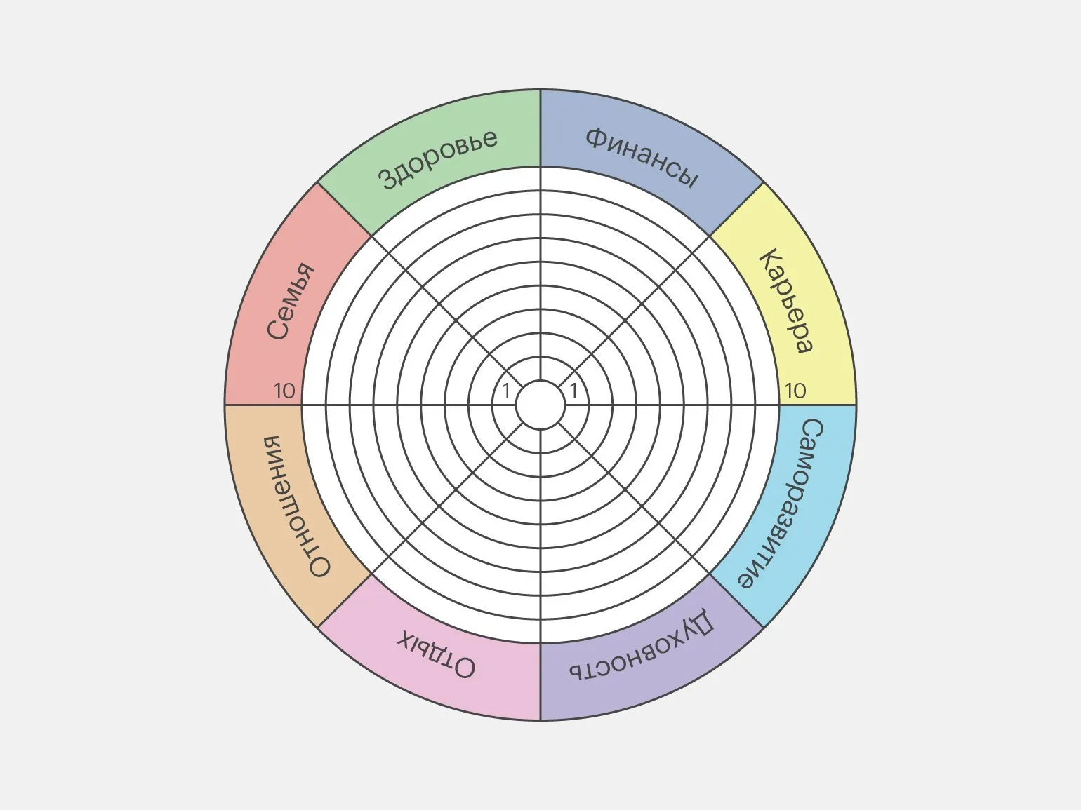 Оцените каждую сферу жизни по шкале от 1 до 10 и закрасьте соответствующее количество ячеек в каждом секторе. Количество и название сфер жизни можно определить персонально для себя.