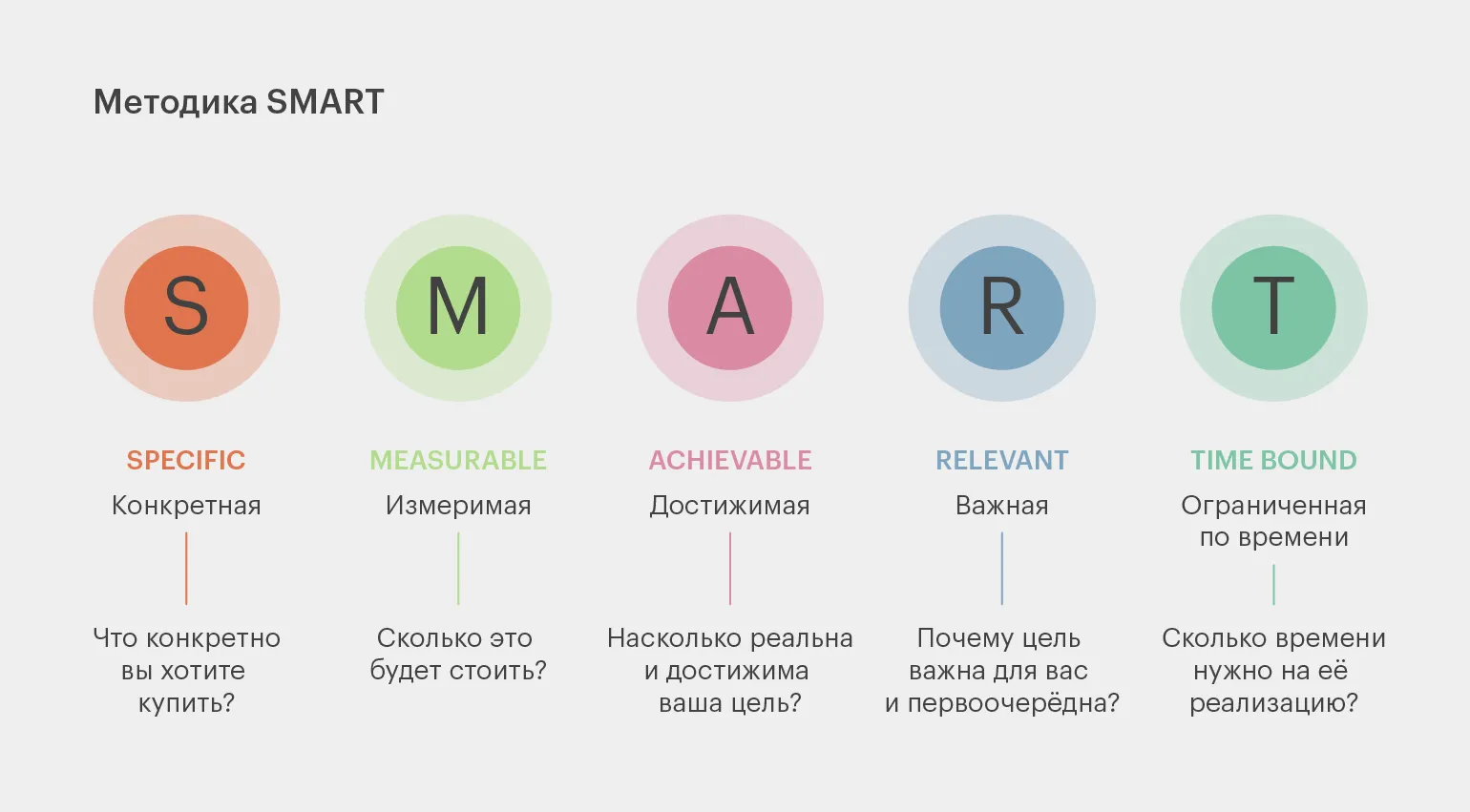 Оценить свою цель поможет концепция SMART. По этой методике цель должна быть конкретной (specific), измеримой (measurable), достижимой (attainable), важной (relevant) и ограниченной во времени (time-bound).