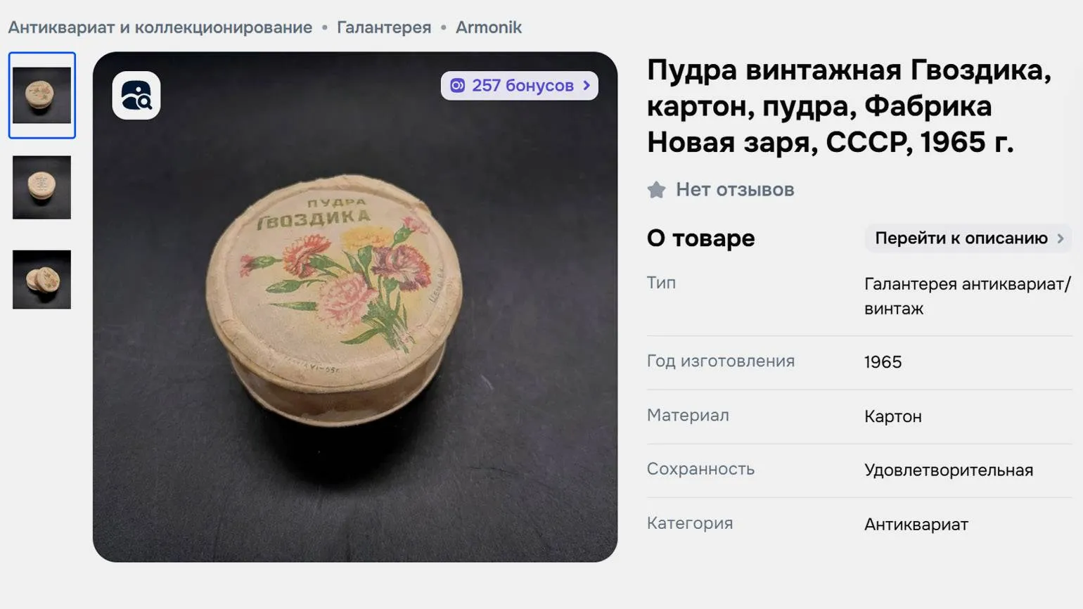 Стоимость лотов самая разная — от нескольких рублей за брусок мыла до нескольких тысяч рублей за флакон духов. Например, открытая упаковка пудры «Гвоздика» фабрики «Новая заря» в антикварном магазине стоит 3,5 тысячи рублей.