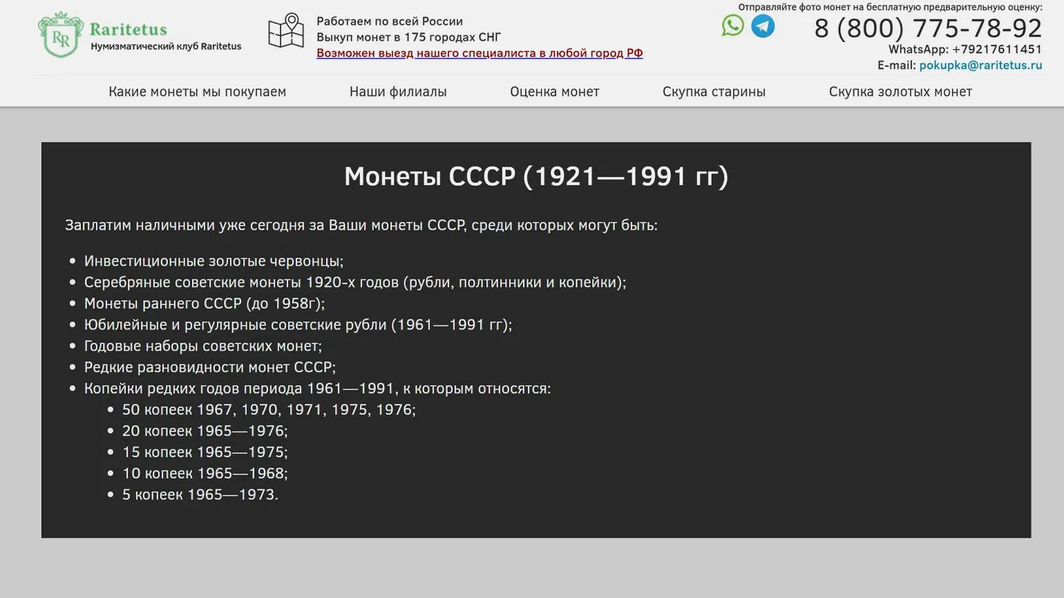 Однако и на обычные монеты — так называемую ходячку — есть спрос. Например, нумизматический портал Raritetus скупает юбилейные и регулярные советские рубли как раннего, так и позднего периода. Там же в каталоге можно найти и проверить ориентировочную стоимость монет на текущую дату — по свежим данным с аукционов. Или отправить фото для оценки специалистам портала.