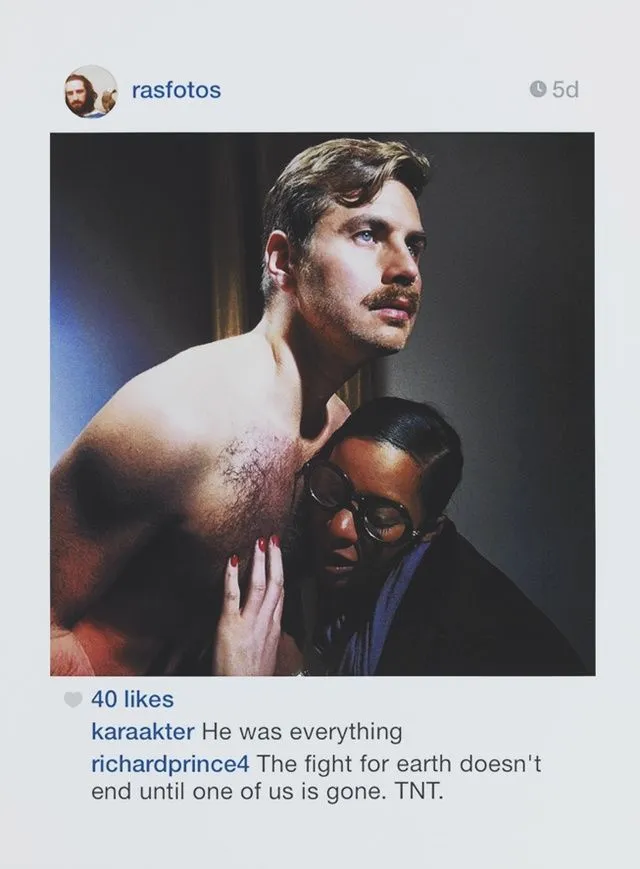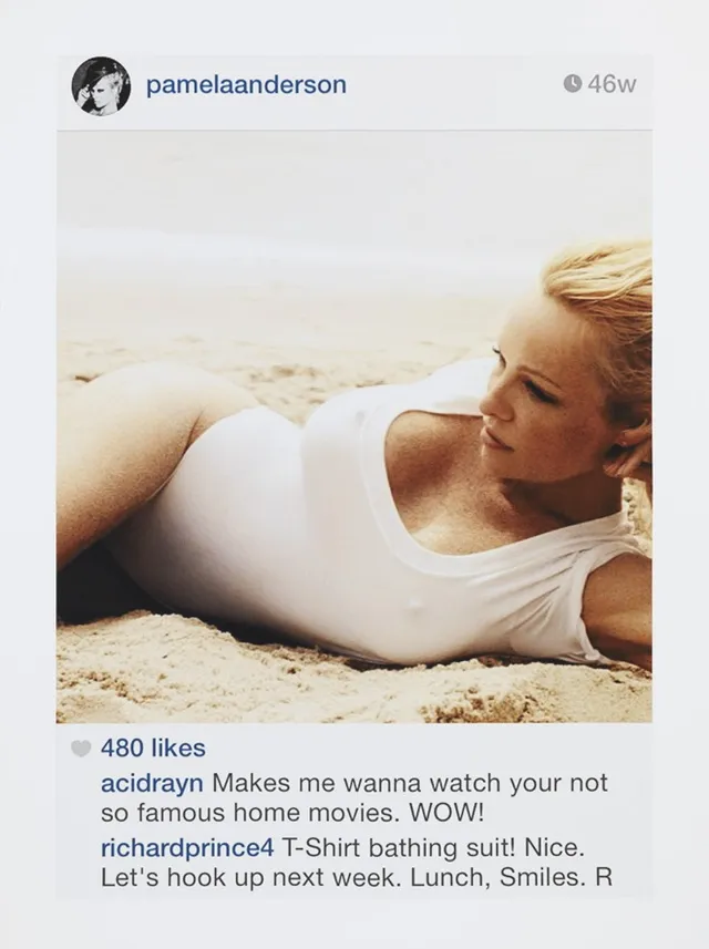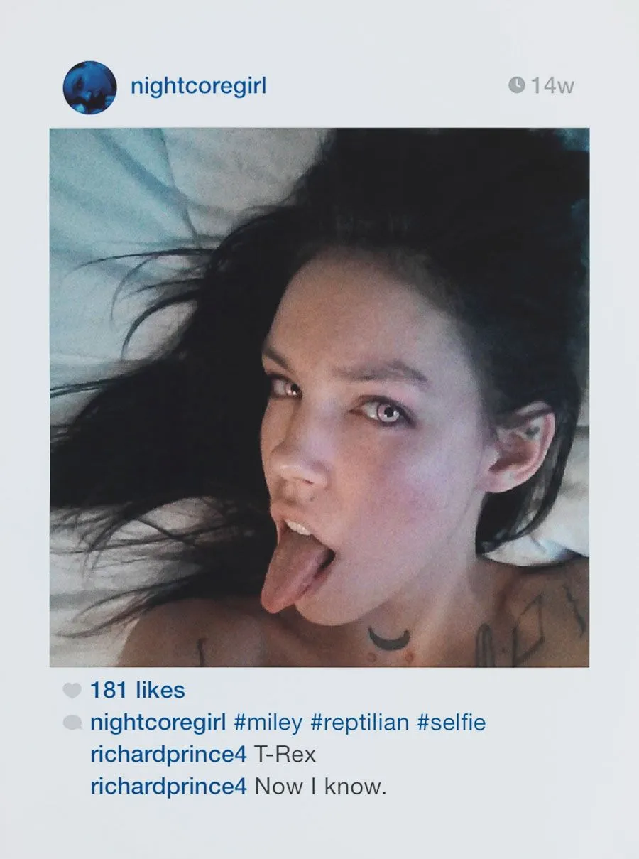 Ричард Принс известен работами, в которых он присваивает найденные изображения, переосмысляя границы авторства. В серии «Новые портреты» / New Portraits Принс использовал скриншоты фотографий из «Инстаграма»*, добавив к ним собственные комментарии. Таким образом он создал новую интерпретацию уже существующих снимков, поместив их в контекст галерейного пространства. Работа вызвала дискуссии о приватности, авторских правах и смысле изображения в эпоху цифровых медиа.