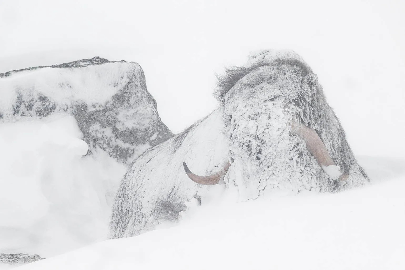 Эти животные обладают исключительной способностью выживать в самых экстремальных погодных условиях. Фотограф задокументировал поведение овцебыков во время сурового зимнего шторма: они экономят энергию, пытаясь сохранить тепло своего тела и защитить себя и своих телят, собравшихся в центре группы, от сильного ветра.
