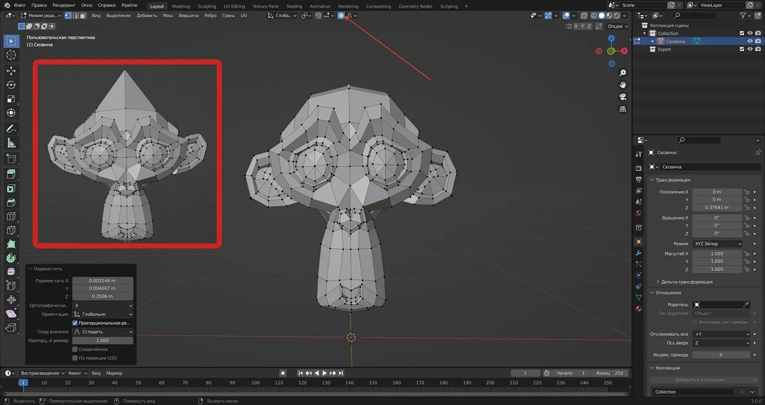 Результат трансформации с выключенным (в рамке) и включённым режимом «Пропорциональное редактирование» (Proportional Editing Objects). Стрелкой отмечено расположение значка опции Скриншот: Леон Балбери для Skillbox Media