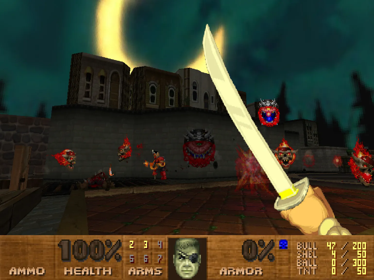 Как понятно из названия, этот мод на GZDoom совмещает в себе Doom и Blood. Причём делает это в прямом смысле: в его восьми уровнях карты из обеих игр сливаются в одну. Можно увидеть знакомые элементы уровней как Doom, так и Blood.
