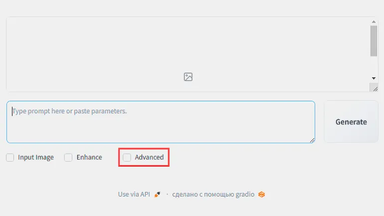 5. В отдельной вкладке загрузится интерфейс нейросети — обычно это происходит за 1–2 минуты, но может потребовать чуть больше времени. Изначально интерфейс выглядит сдержанно — чтобы открыть больше настроек, поставьте галочку напротив Advanced.