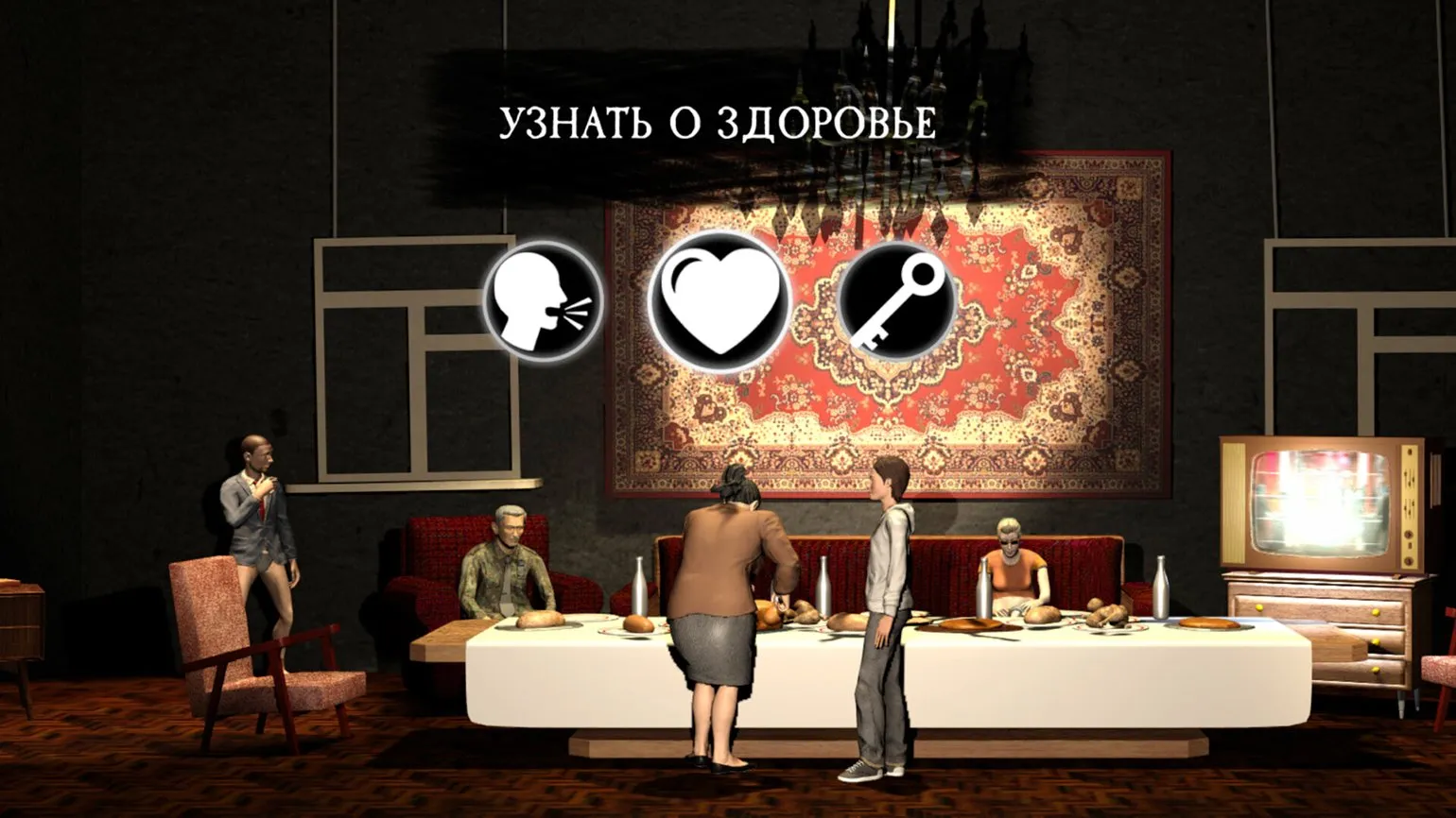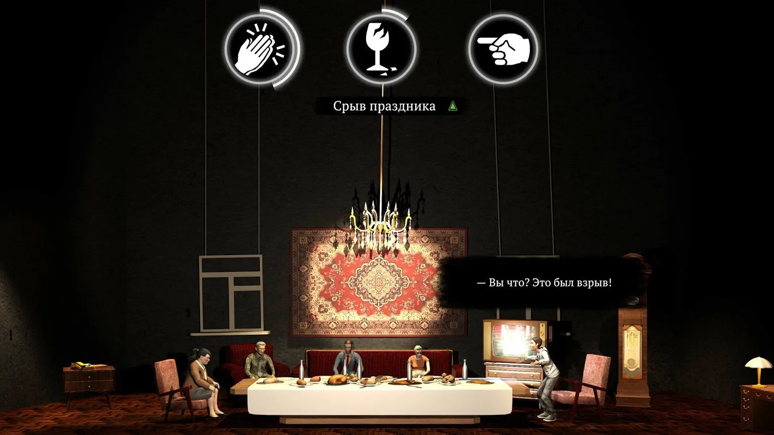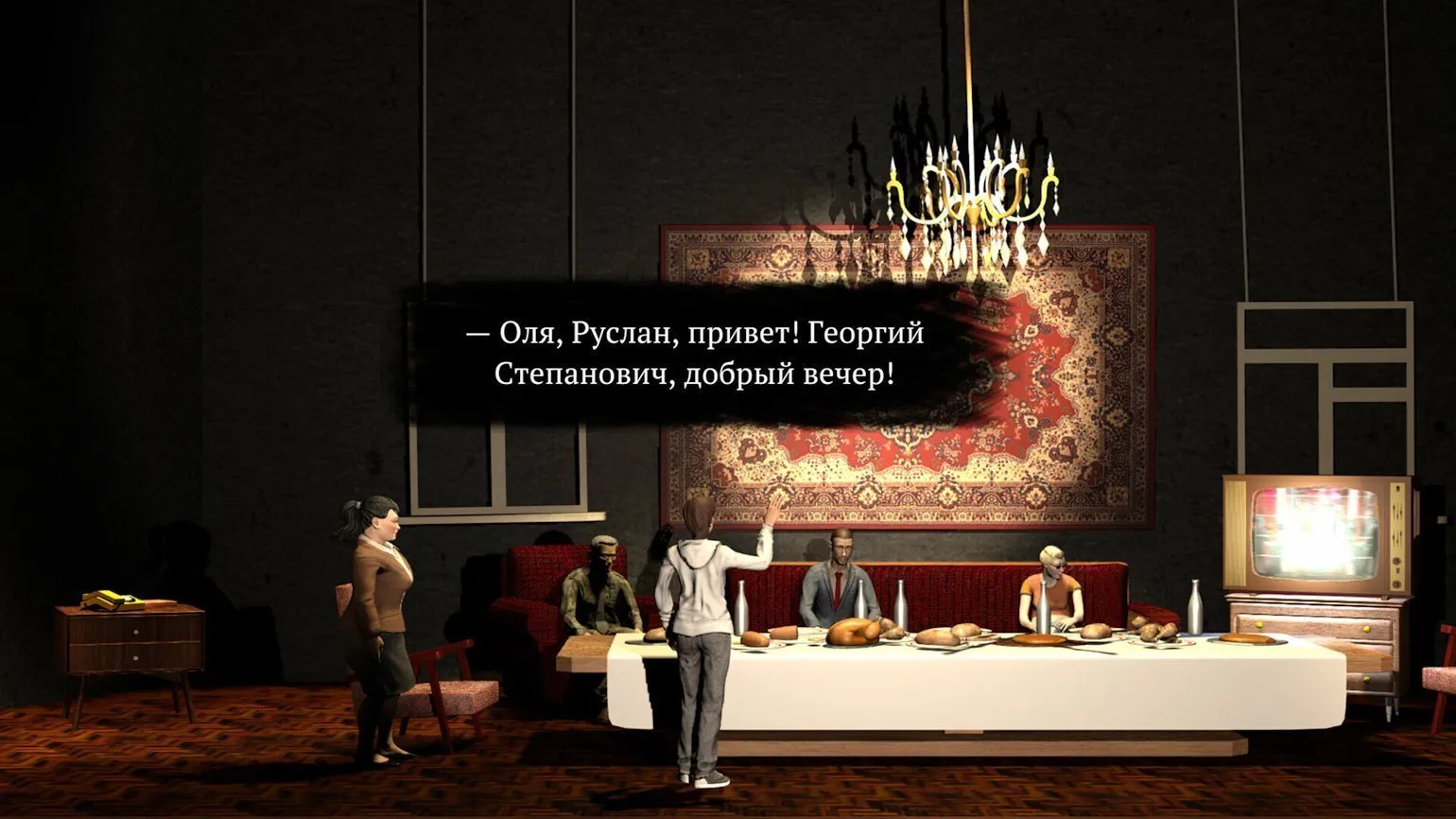 — Потому что оно подходит лучше всего. Вы входите в квартиру, где разворачивается всё действие, и попадаете на праздник. Всем знакомые посиделки с роднёй и друзьями. Нельзя просто взять и уйти: вы вынуждены иметь дело с участниками застолья. Как вести себя с ними — ваше дело. Мы дали игрокам свободу отыгрыша: словно вы актёр, от которого зависит ход спектакля.