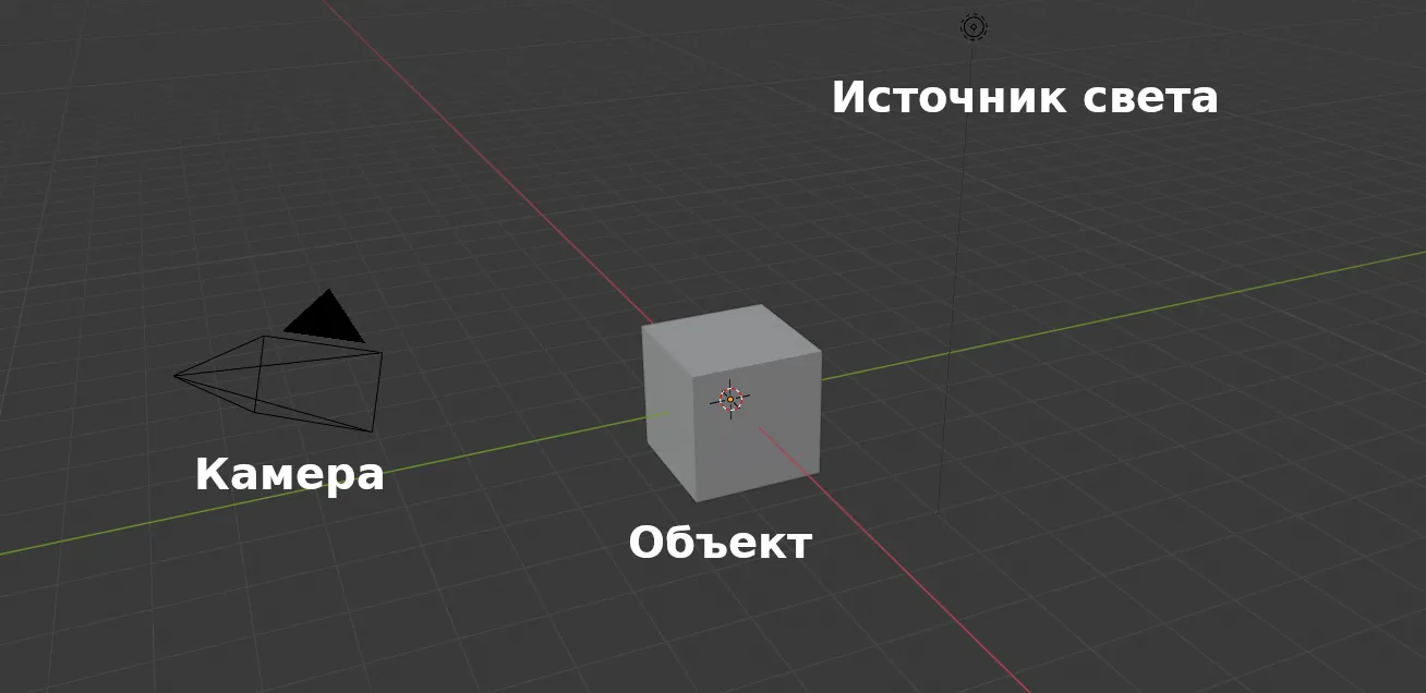 Чтобы компьютер понял, как это всё отобразить, нужен наблюдатель, чьими глазами он будет смотреть на сцену, — камера. А чтобы мы могли хоть что-то разглядеть, нужен источник света.