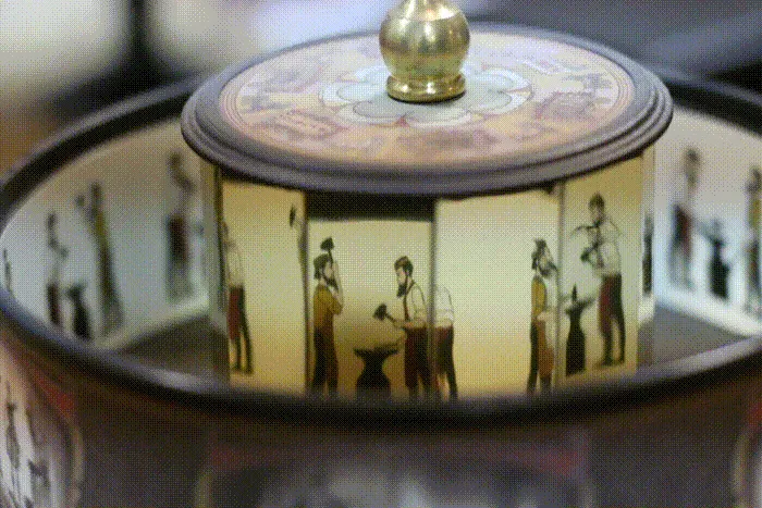В 1877 году был изобретён праксиноскоп — барабан, обклеенный изнутри последовательностью изображений. В его центре есть ещё один барабан поменьше, обклеенный зеркалами. Если смотреть в центр устройства, когда оно вертится, можно увидеть иллюзию движения: