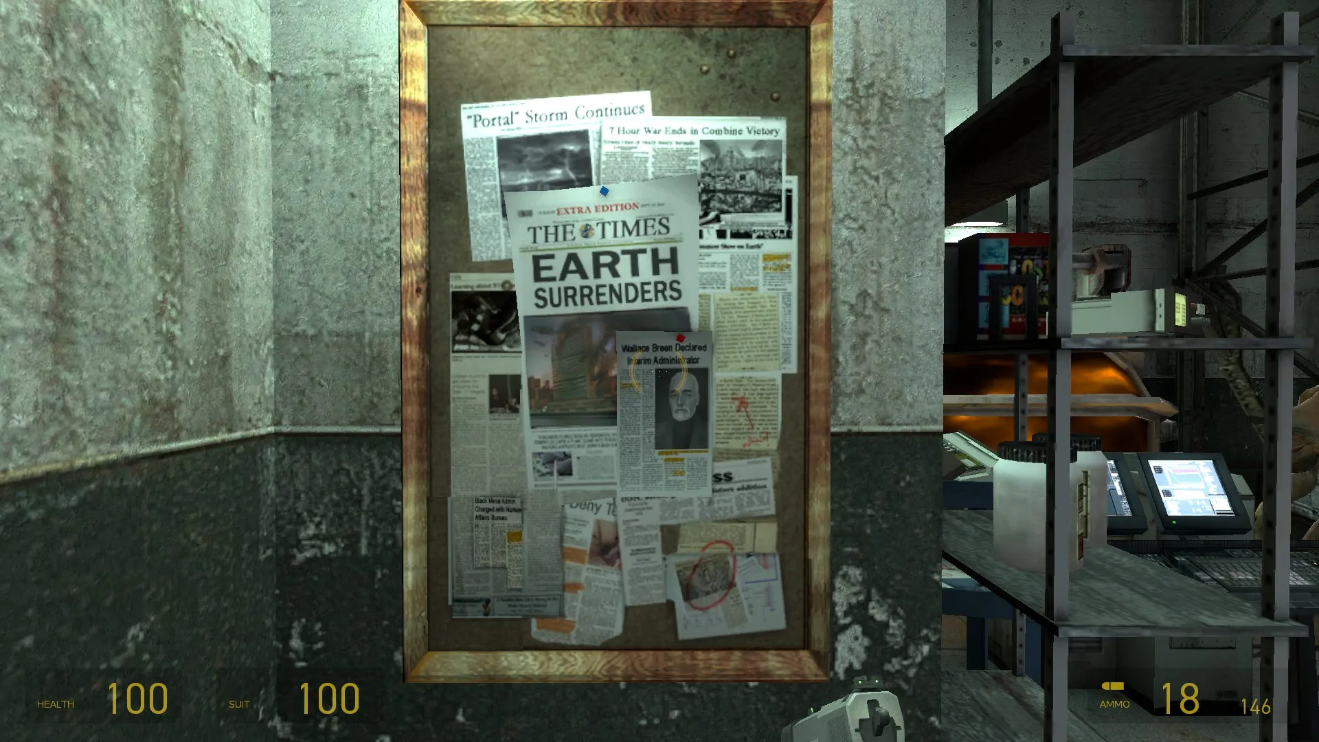 Добравшись до базы Сопротивления, игрок может немного отдохнуть. Тут сюжет раскрывается не только через реплики персонажей, но и через интерьер: рамка с фотографией на столе, научное оборудование, доска с газетными вырезками на стене.
