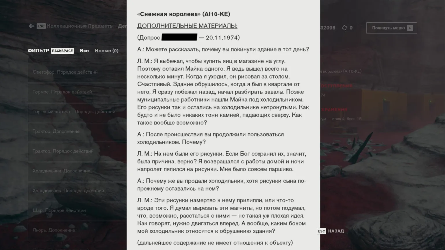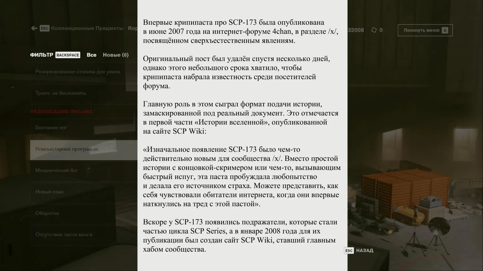 Открыв стандартное дело, мы видим номер объекта и его класс вверху страницы, фотографию в верхнем правом углу, а под ними — условия хранения, подробное описания аномалий и ссылки на приложения (как правило, расшифровки допросов или записей экспедиций). И здесь очень сложно не заметить сходство с документами из Control — тем более, что директор игры Микаэль Касуринен называл вселенную SCP Foundation одним из источников вдохновения для лора Бюро.