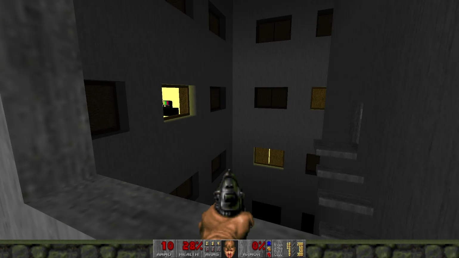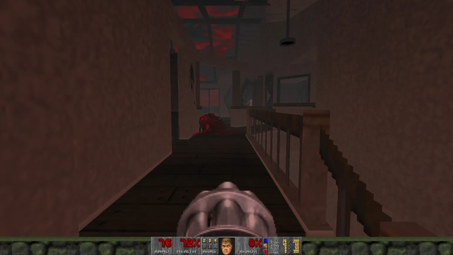 Тогда вы вернётесь внутрь — и обнаружите, что дом неуловимо изменился. Двери больше не сдвигаются в сторону, как принято в Doom, а распахиваются, как в реальной жизни. На прежде пустых местах лежат аптечки и патроны. Внутри шкафчика в ванной теперь находится секретная лестница на прежде недоступный чердак.